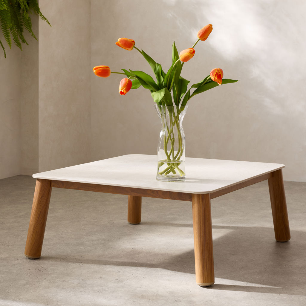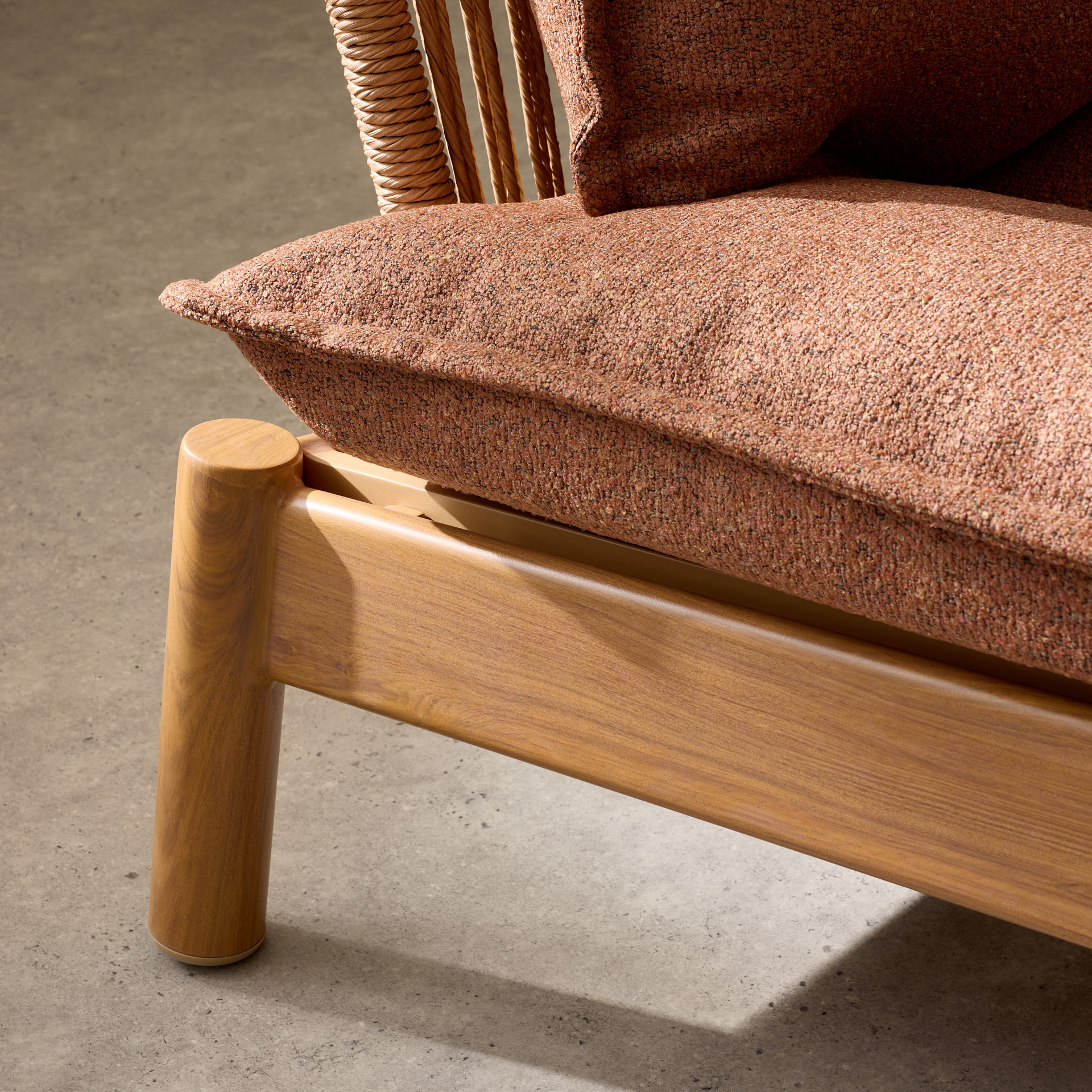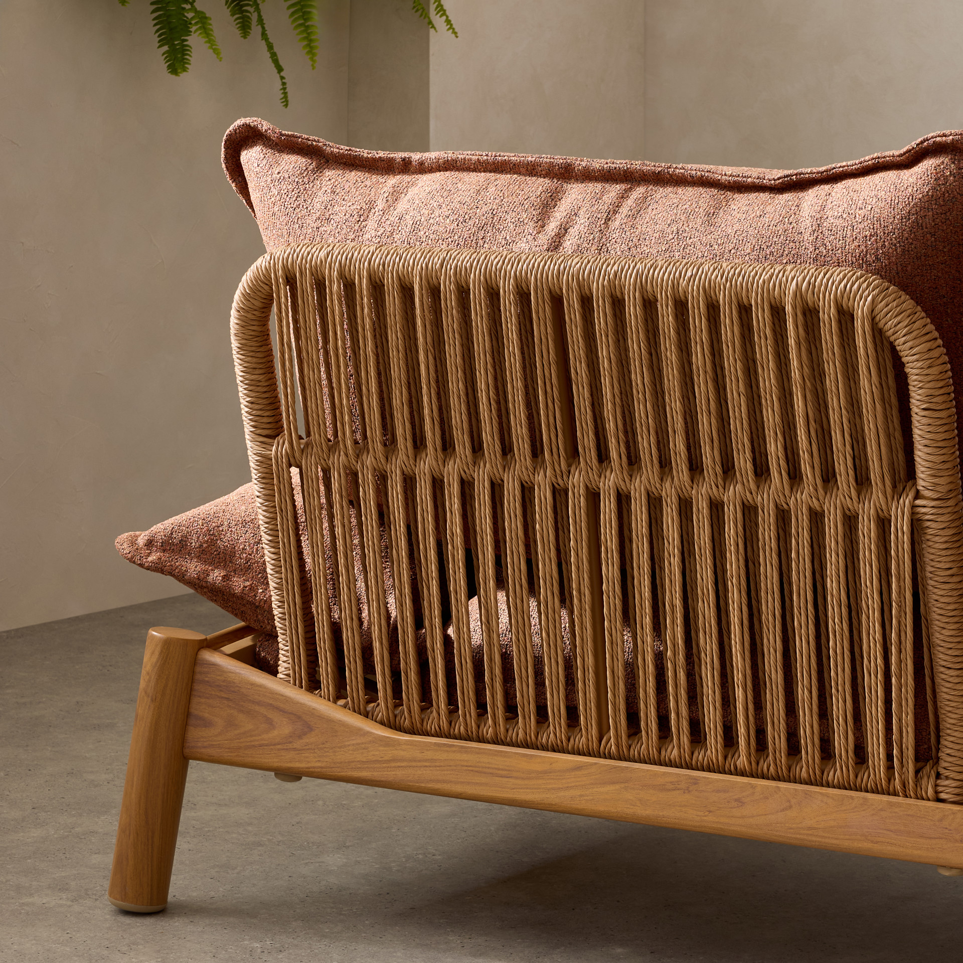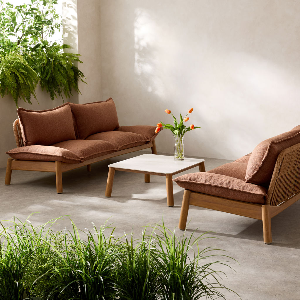 Blending a softly contoured wooden frame with generously padded cushions, it adds a natural yet refined touch to your terrace, balcony, or sunroom.