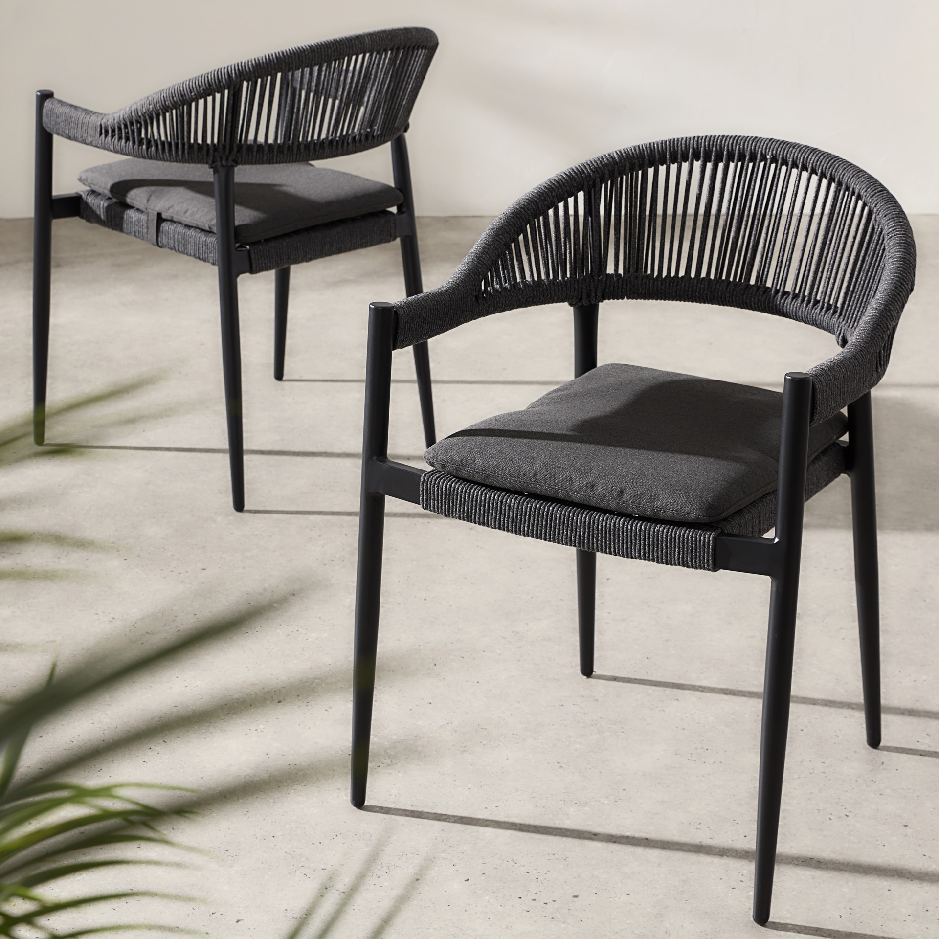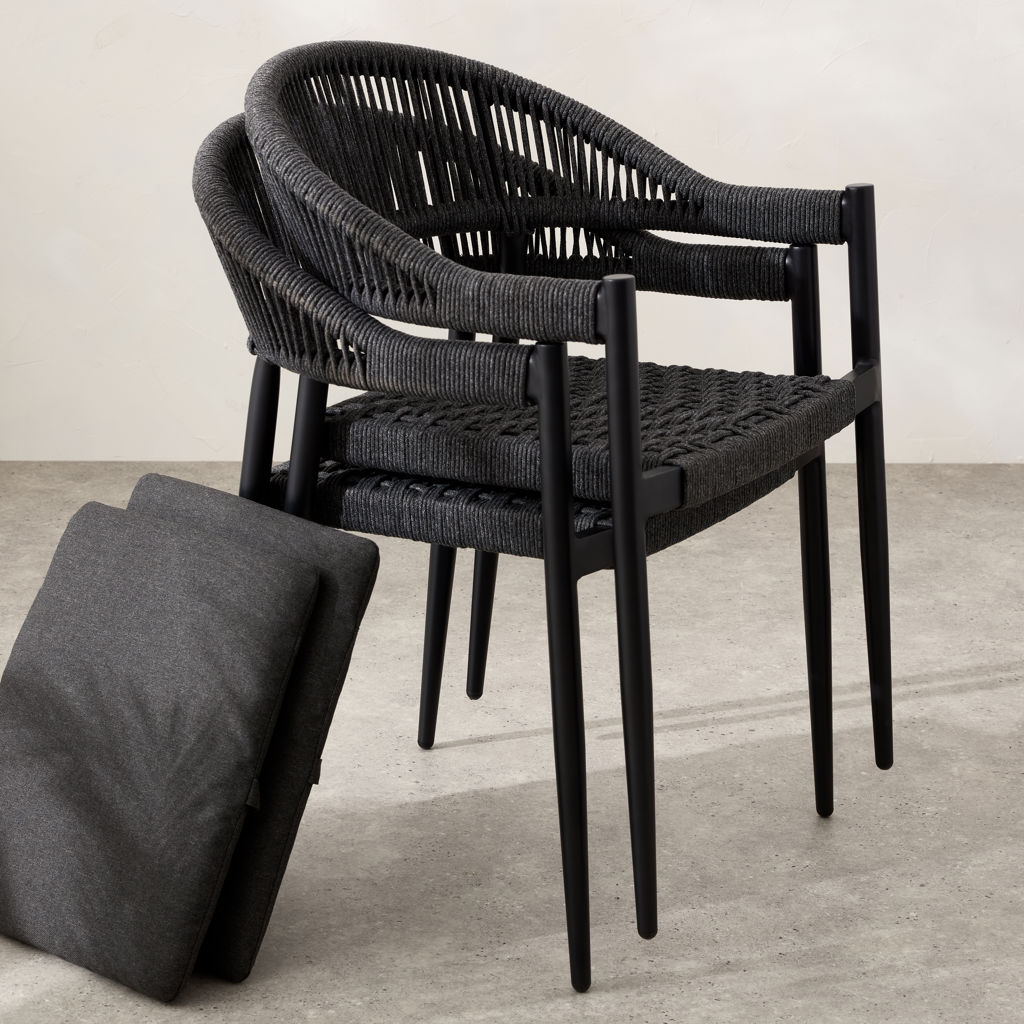 Add a modern touch to your outdoor space with these aluminum stacking chairs. The olefin rope detail adds an elegant touch to the furniture.