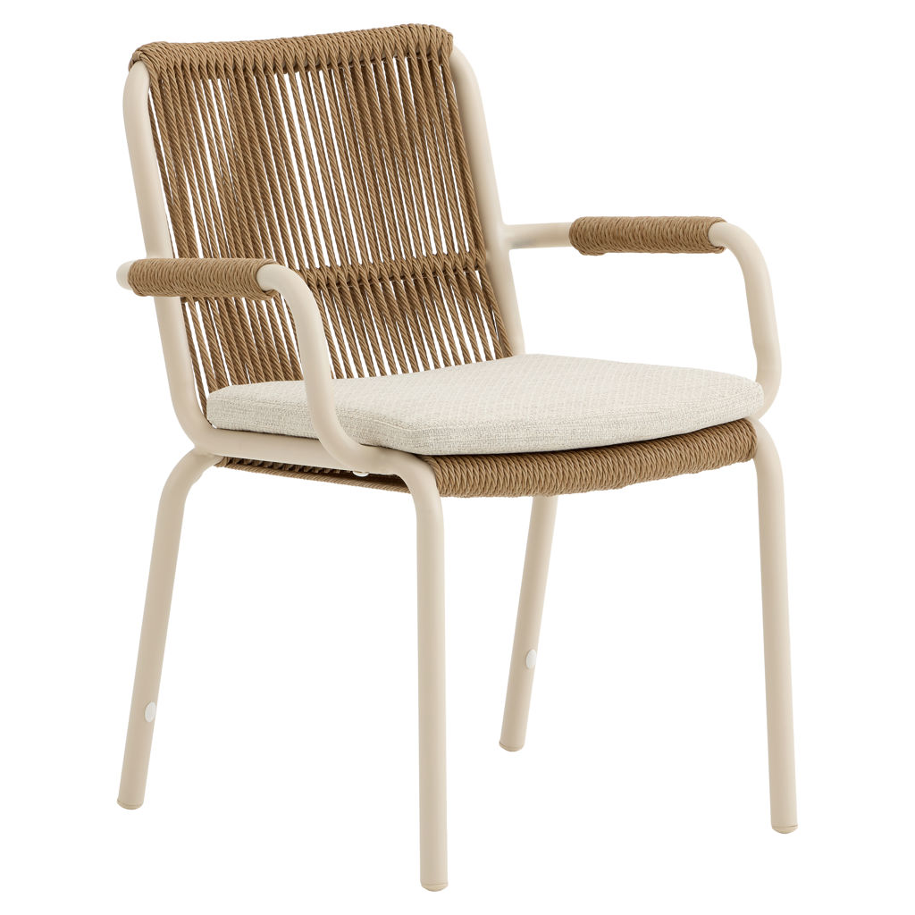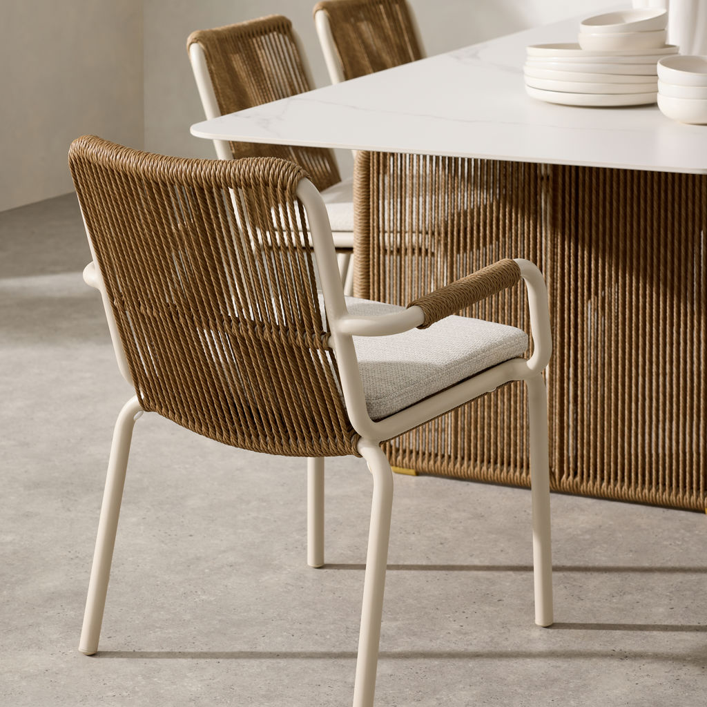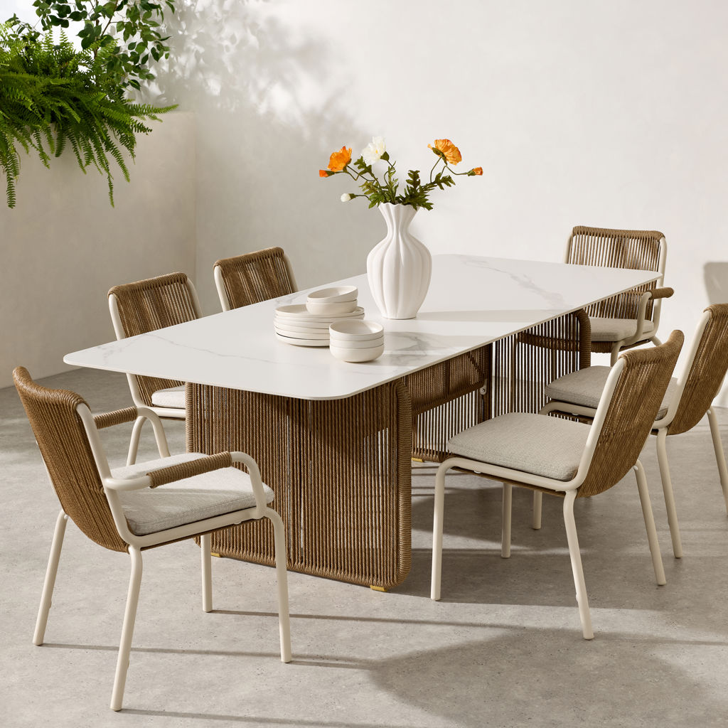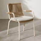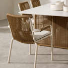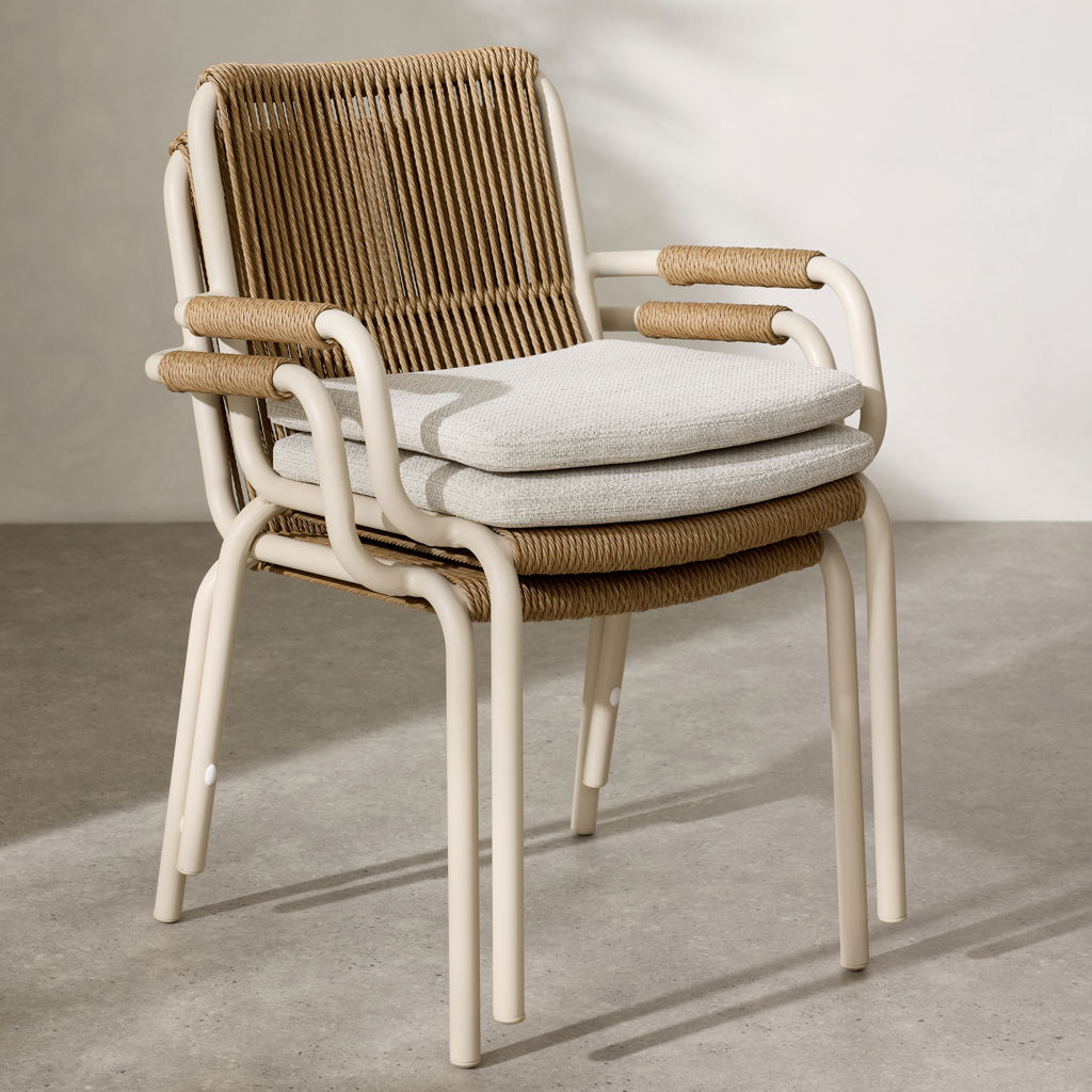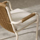 This dining chair features a twisted wicker weave, while powder-coated aluminum frames and exposed cushions ensure stable comfort.