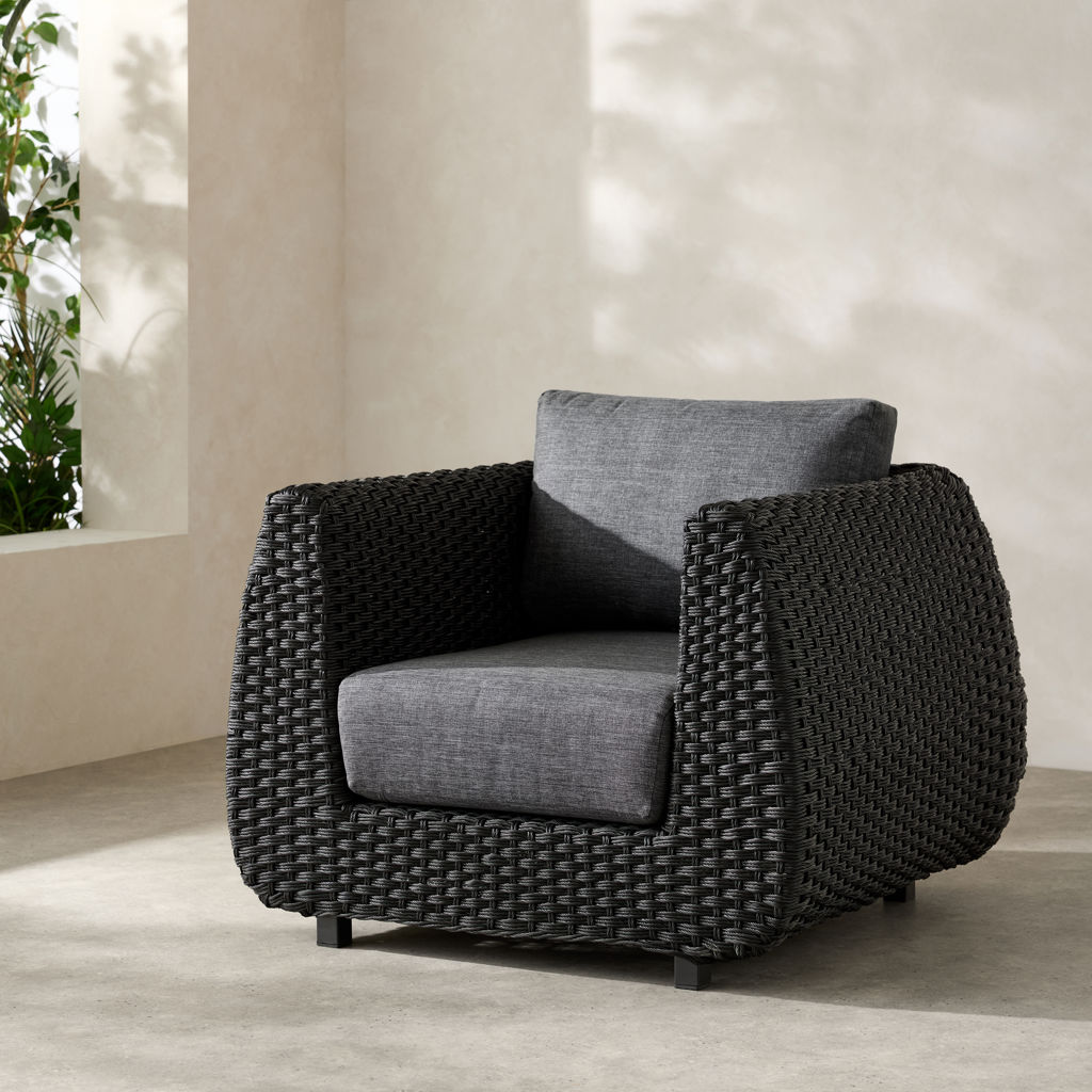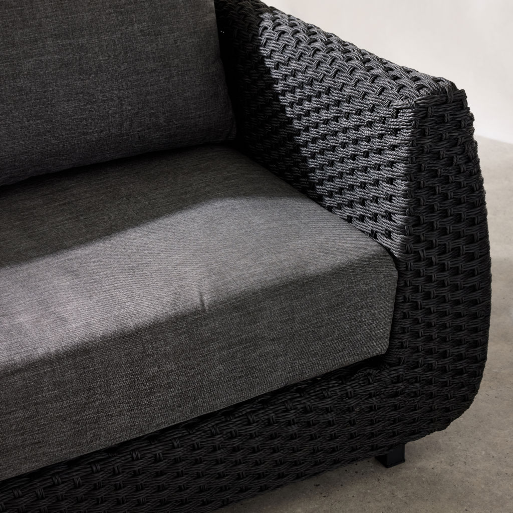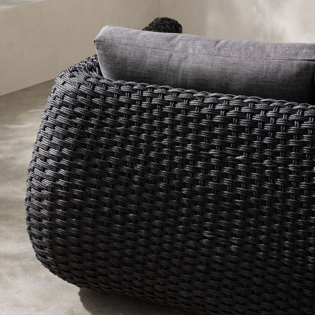 The dark woven finish adds depth and character, while the thick charcoal-gray cushions provide enveloping comfort.