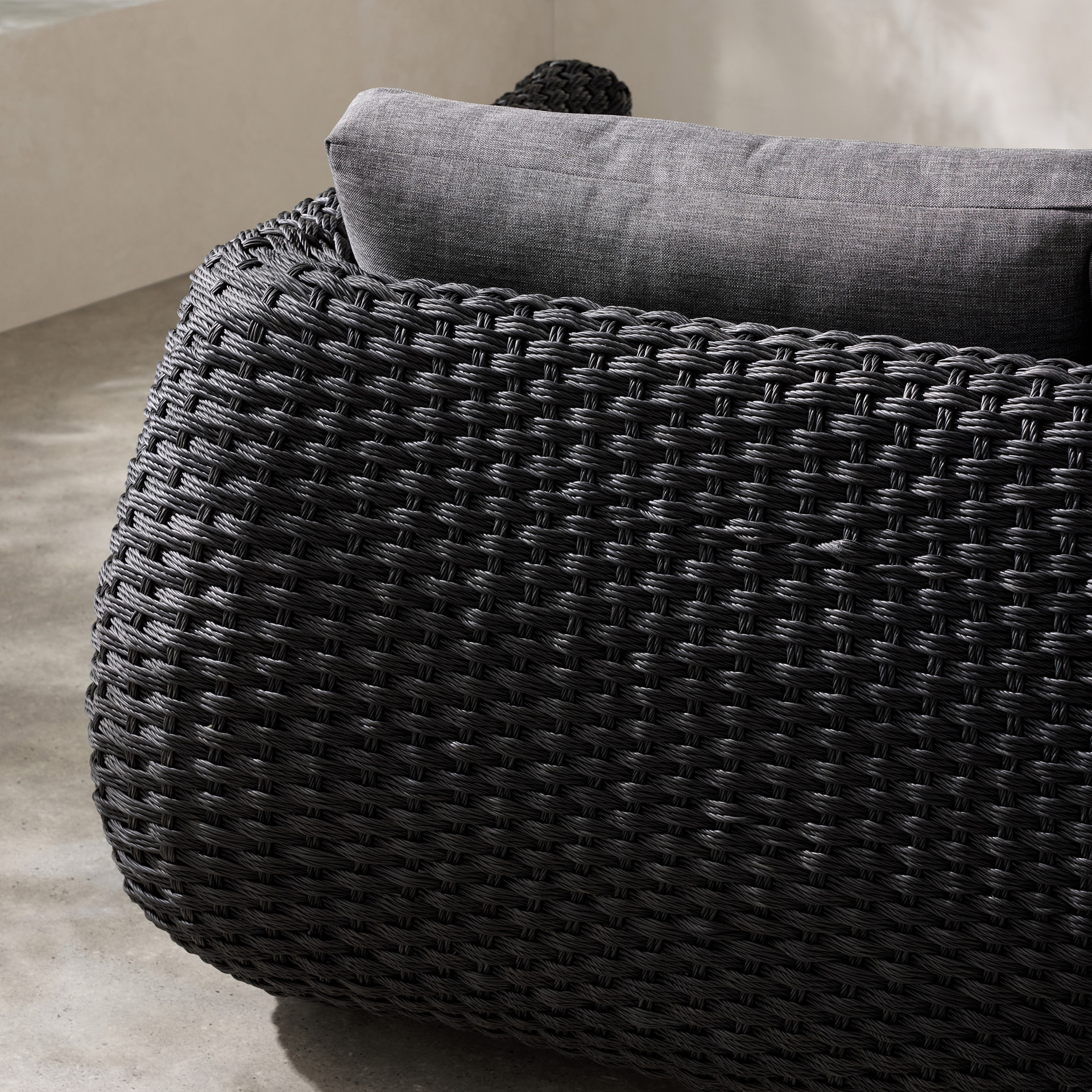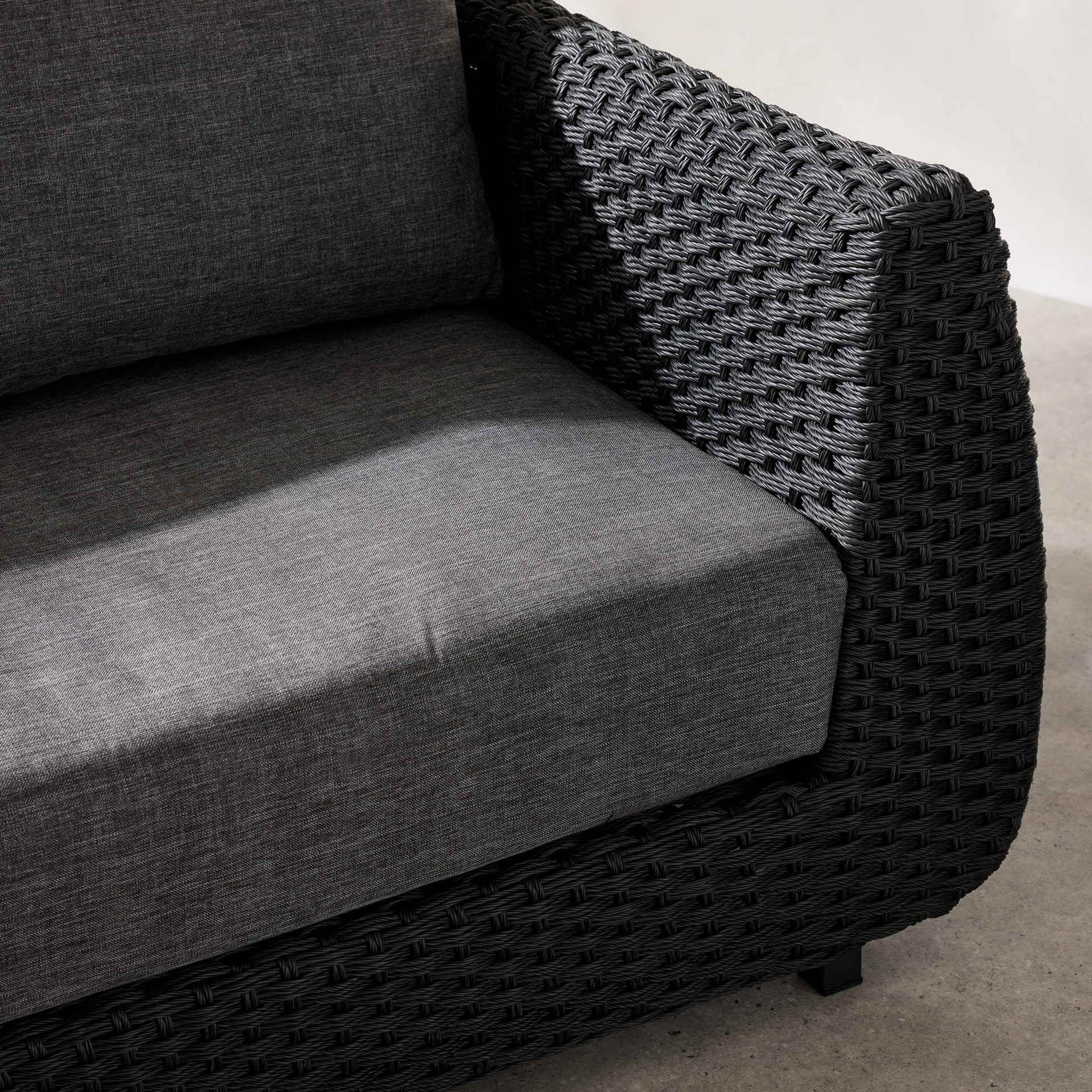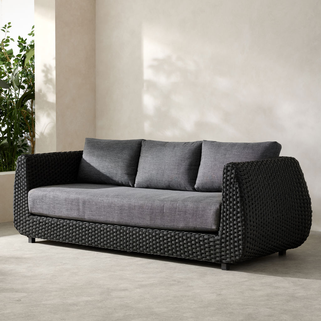 The dark woven finish adds depth and character, while the thick charcoal-gray cushions provide enveloping comfort.