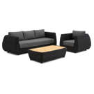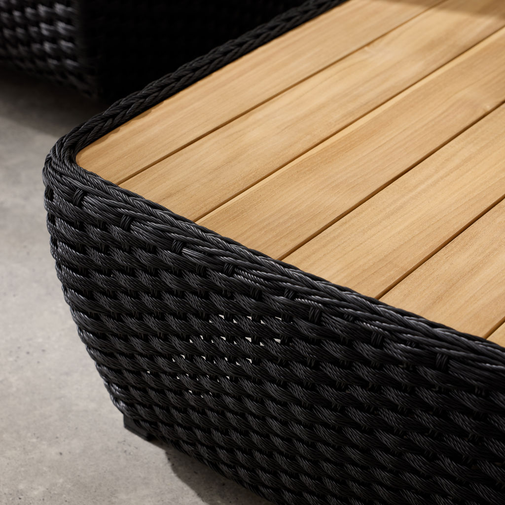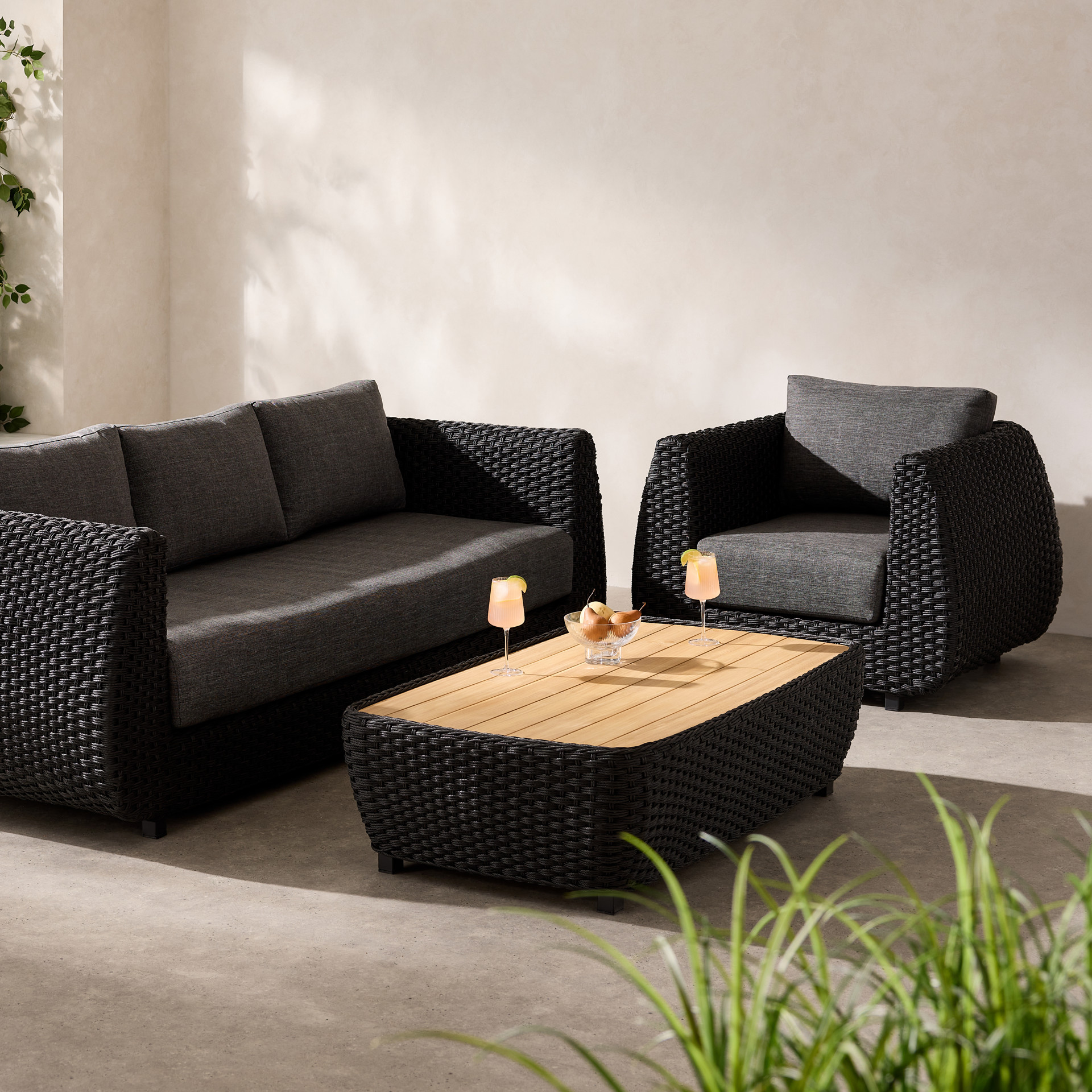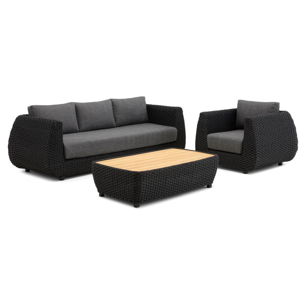 Create a refined outdoor lounge area with this modern, structured conversation set. Featuring a sofa, an armchair, and a matching coffee table, it forms an elegant seating space, perfect for entertaining or relaxing outdoors.