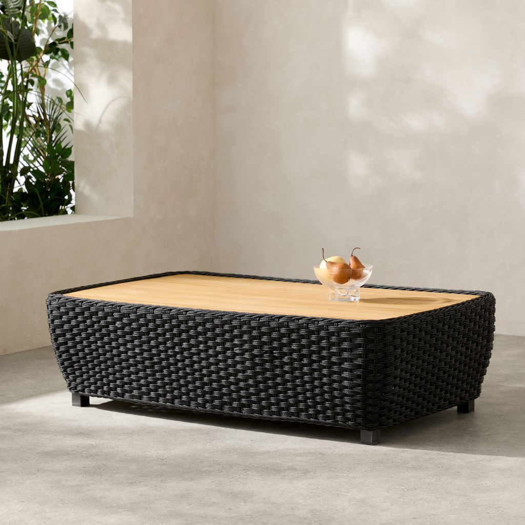 The natural-finish coffee table introduces a warm contrast and offers a practical surface for drinks and accessories.