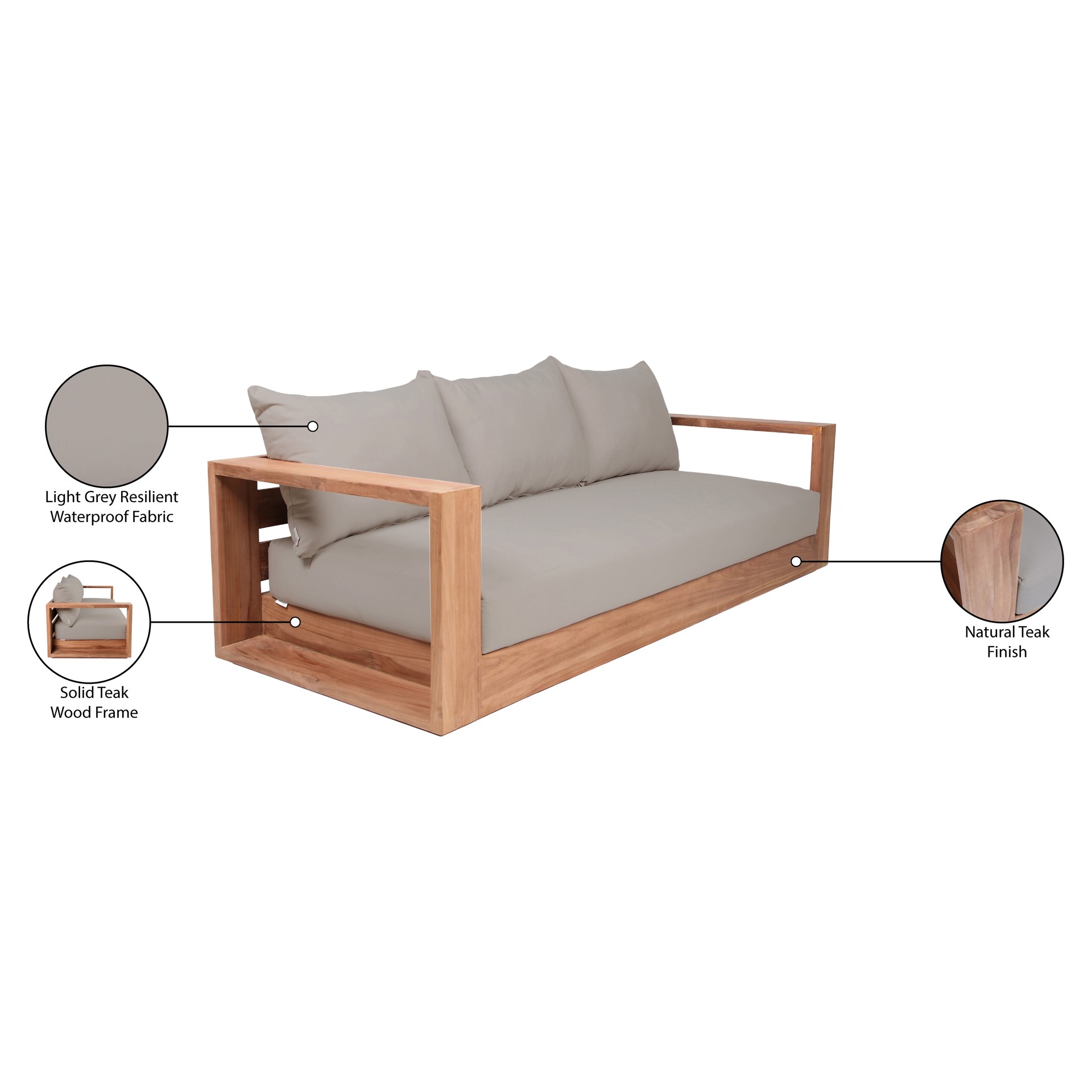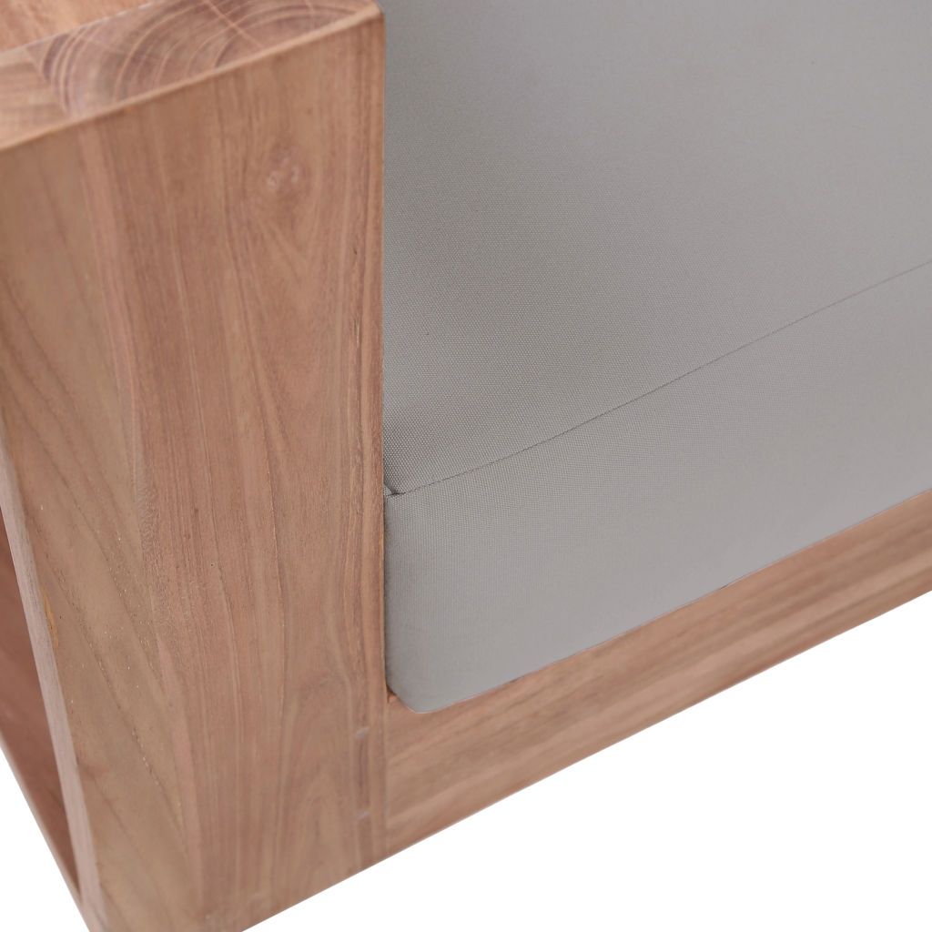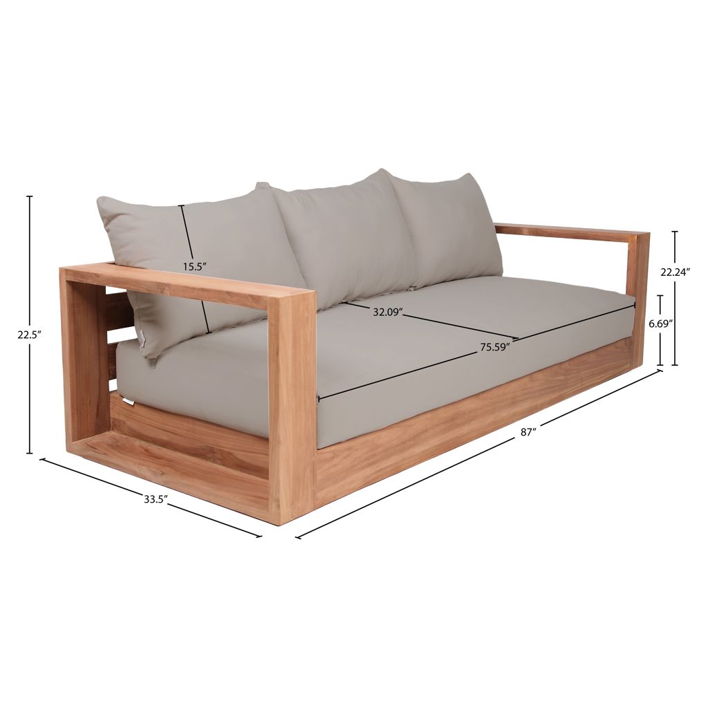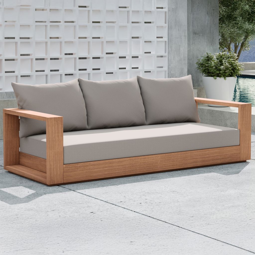 Make this Tulum teak outdoor patio sofa the go to spot for relaxing and entertaining guest in your outdoor space. This sofa features resilent water resistant grey fabric making it the perfect spot to rest your feet and enjoy the company of friends or family while you take in the sunrise.