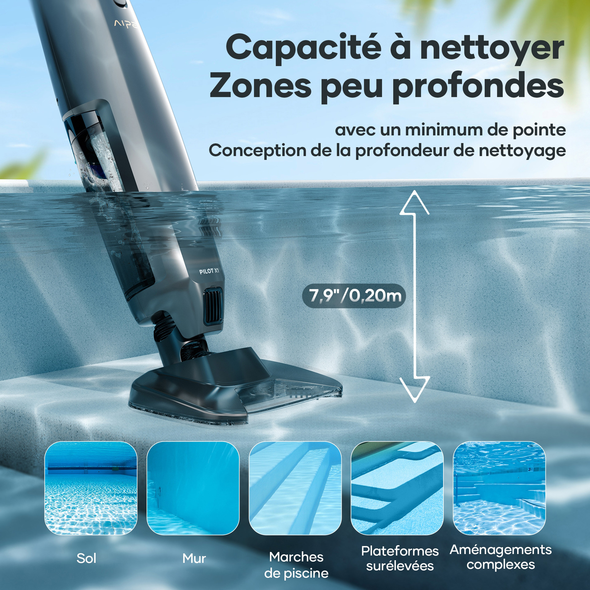 Designed to clean at a minimum depth of 0.2m/7.9”, the Aiper Pilot X1 ensures every corner is covered with precision. Tackle every corner with exceptional effectiveness—ensuring no detail is overlooked!