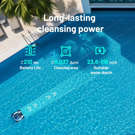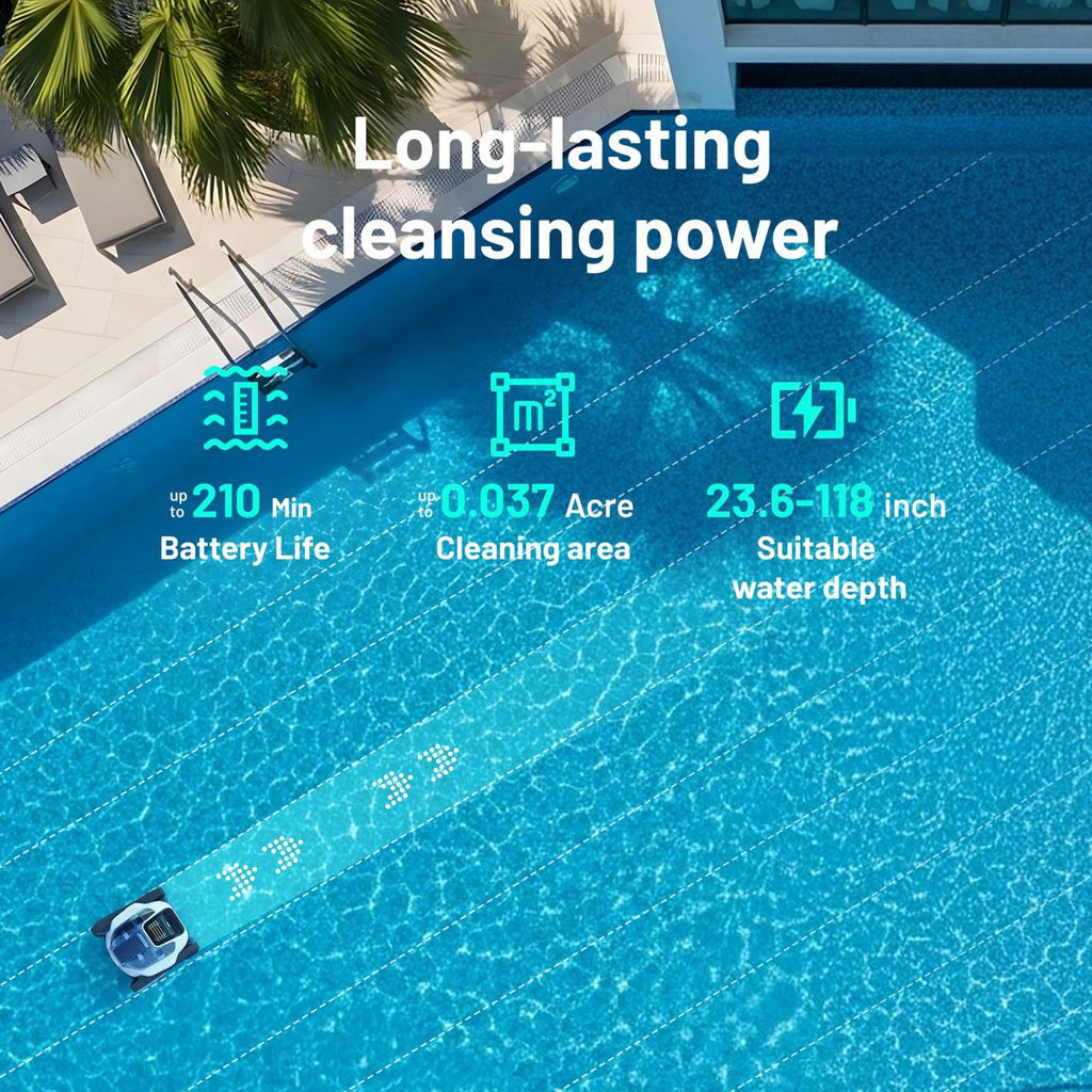 The robot operates for up to approximately 210 minutes (3 hours 30 minutes) on a single charge, covering areas up to approximately 150 m² (1600 sq. ft.), making it ideal for most residential pools.