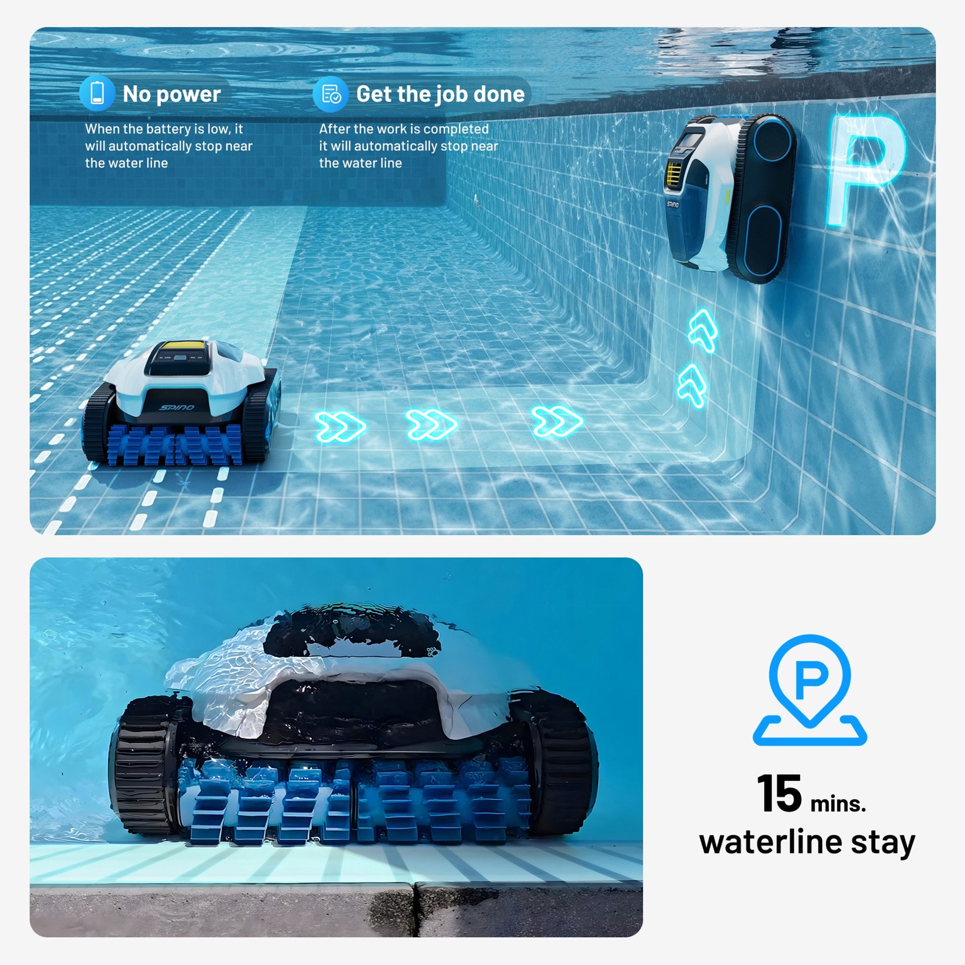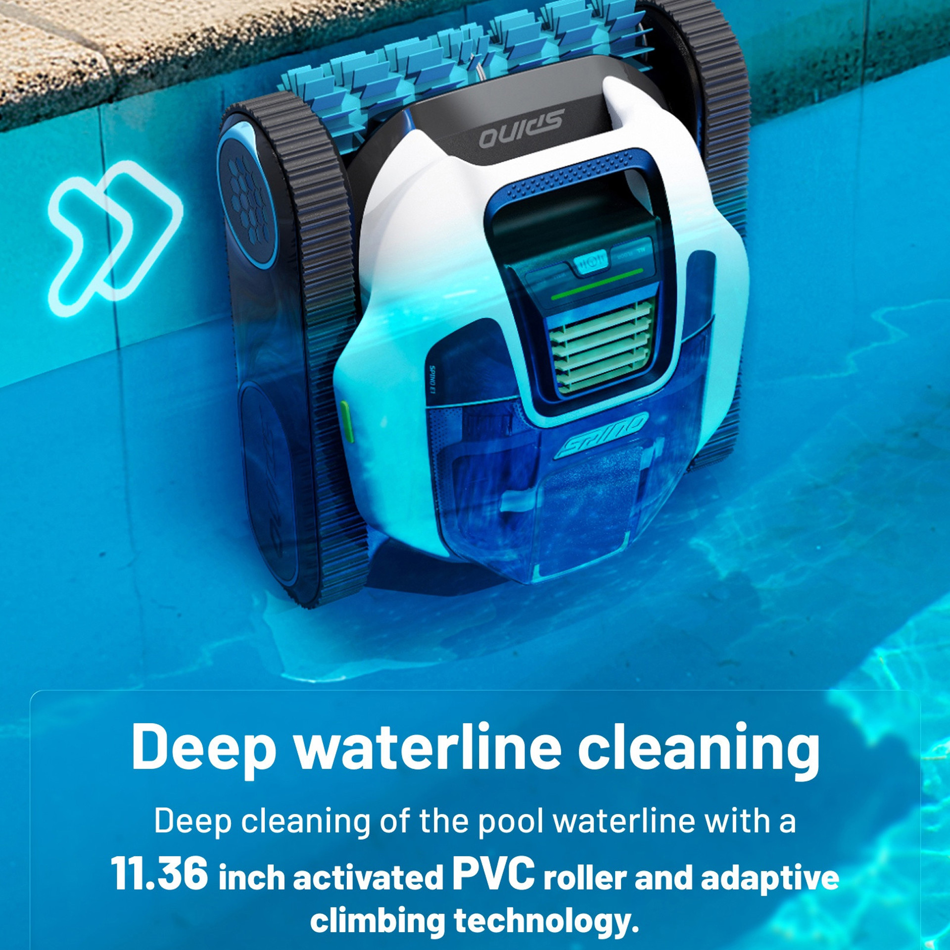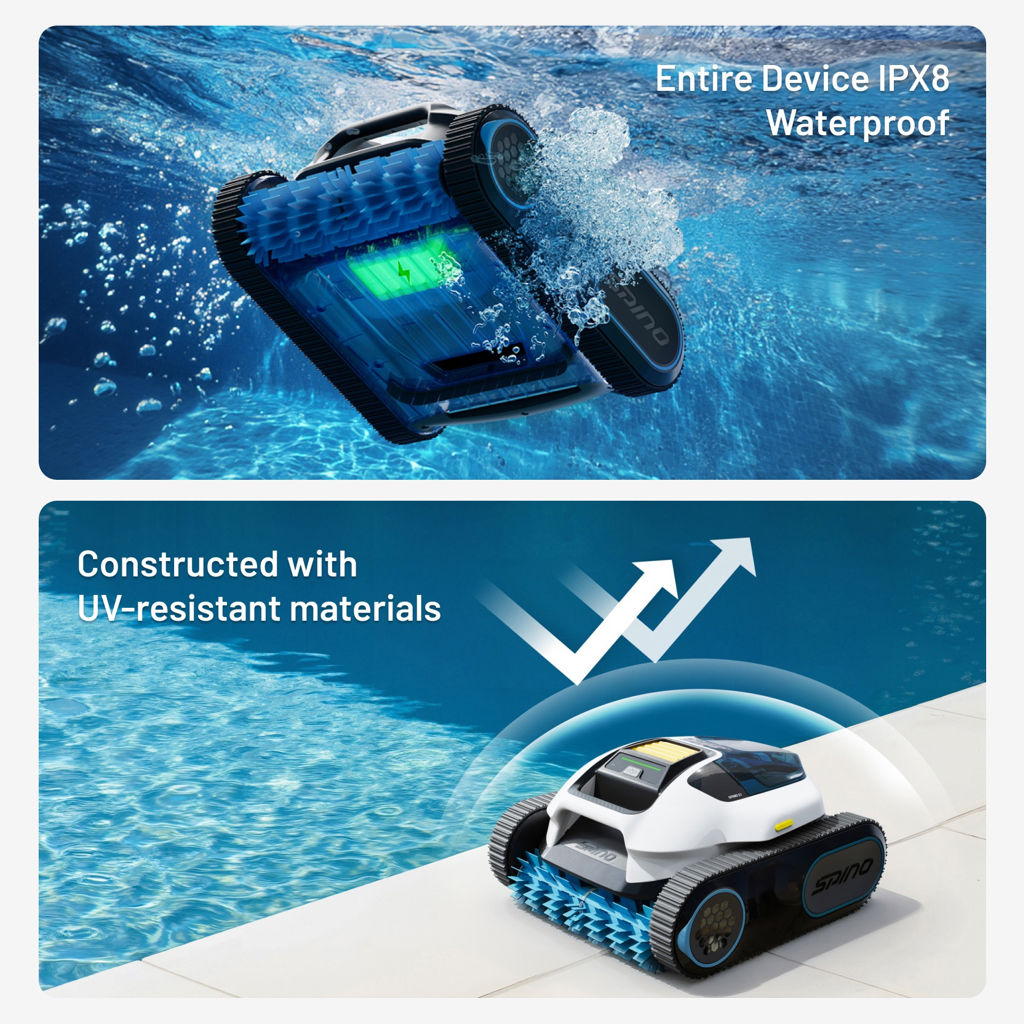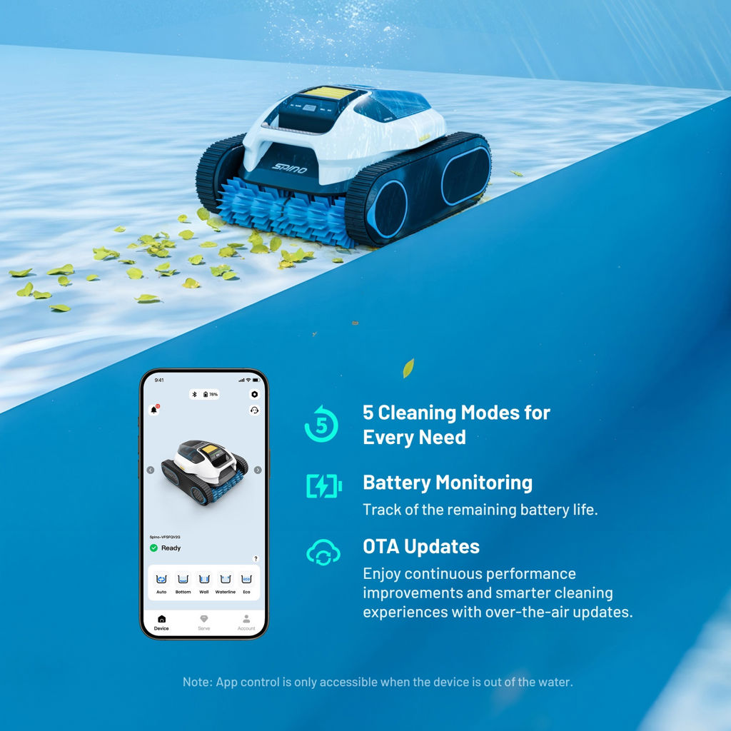Thanks to its advanced cleaning system and wall-climbing capability of up to approximately 110°, the Spino E1 delivers full pool maintenance in a single cycle. It is designed to effectively clean hard-to-reach areas and remove embedded dirt.
