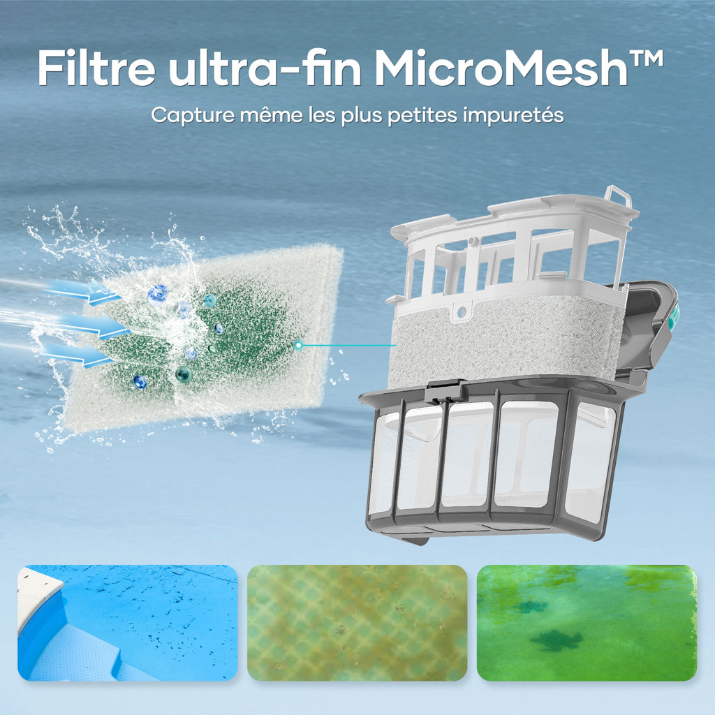 - 3 um MicroMesh™ replaceable ultra-fine filter: Ideal for fine debris, such as dust and algae. Perfect in low-debris environments to ensure ultra-clean, crystal-clear water. To maintain the 3-micron filter at optimum performance, rinsing after each use and occasional replacement are recommended.