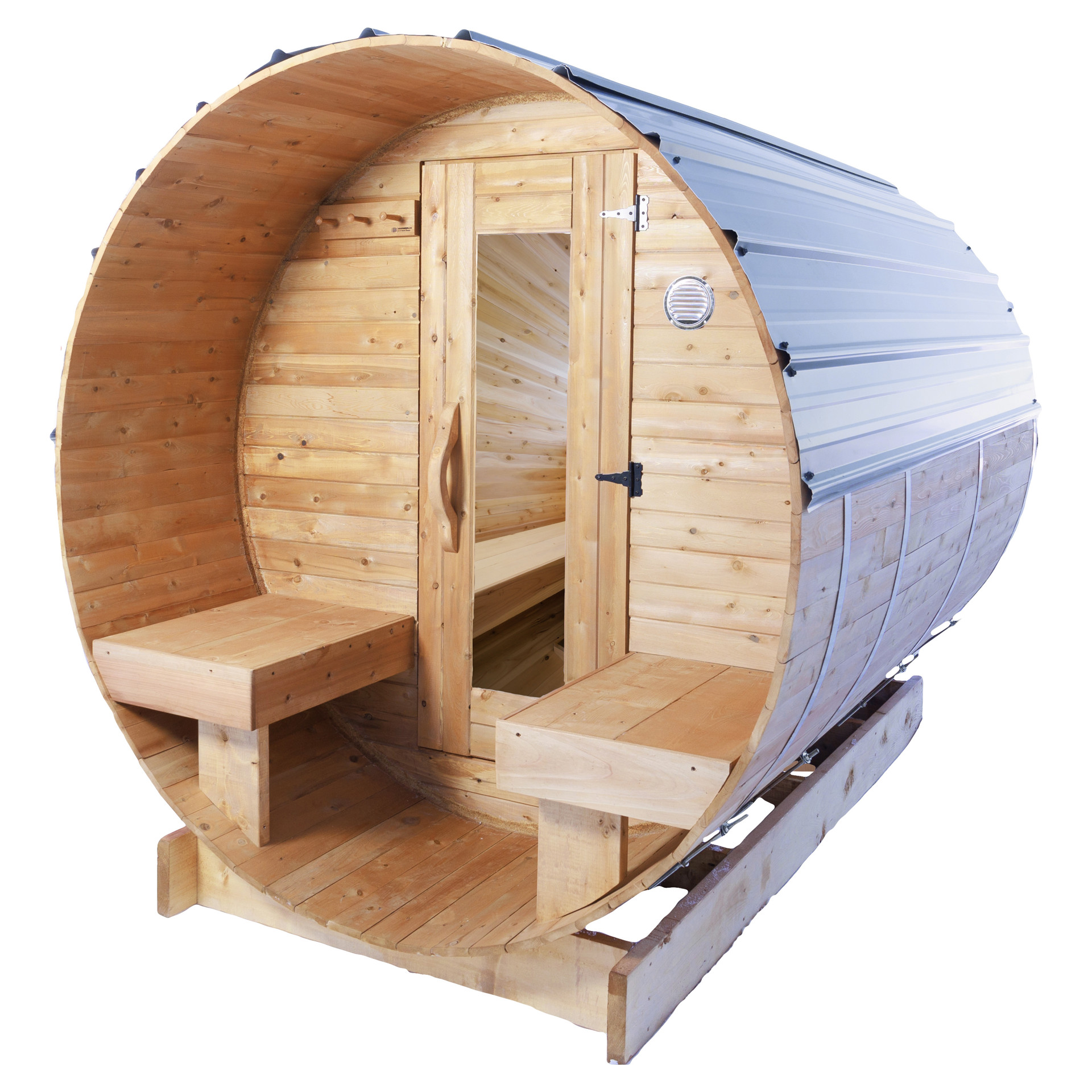 The red cedar barrel sauna offers an authentic sauna experience, with embracing warmth and a natural woody scent that stimulates the senses. The 1” thick plank surface offers high resistance to humidity, while maintaining constant heat in the interior of the sauna.