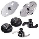 It includes a spiral blade for veggie noodles, a ribbon blade for wide veggie ribbons, an adjustable slicing blade with 6 thickness settings, a reversible shredding disc for fine or coarse shreds, an S-blade for chopping and pureeing, and a dough blade. The simple Stack & Snap™ assembly system requires no complicated locking.