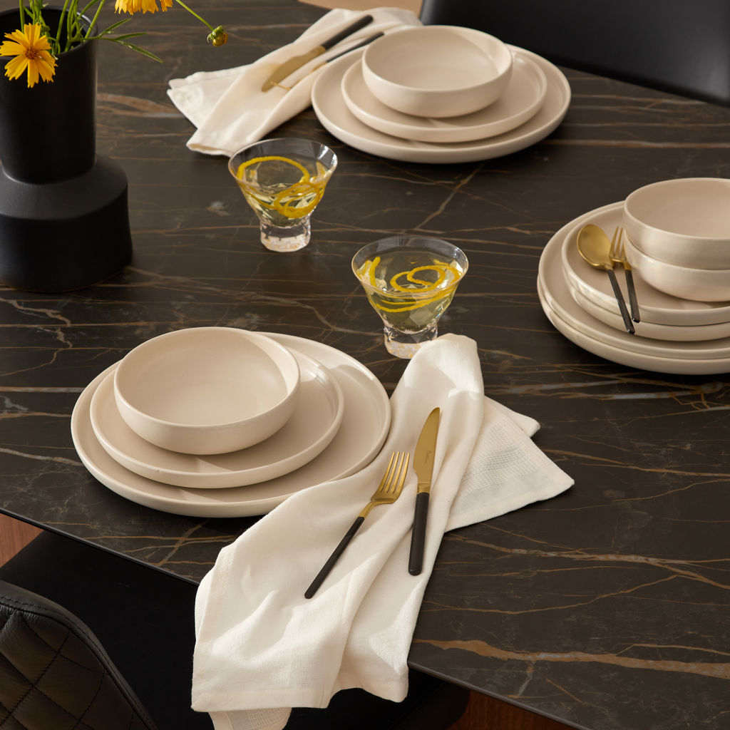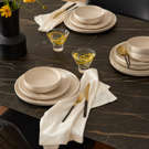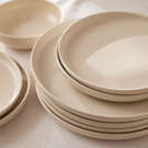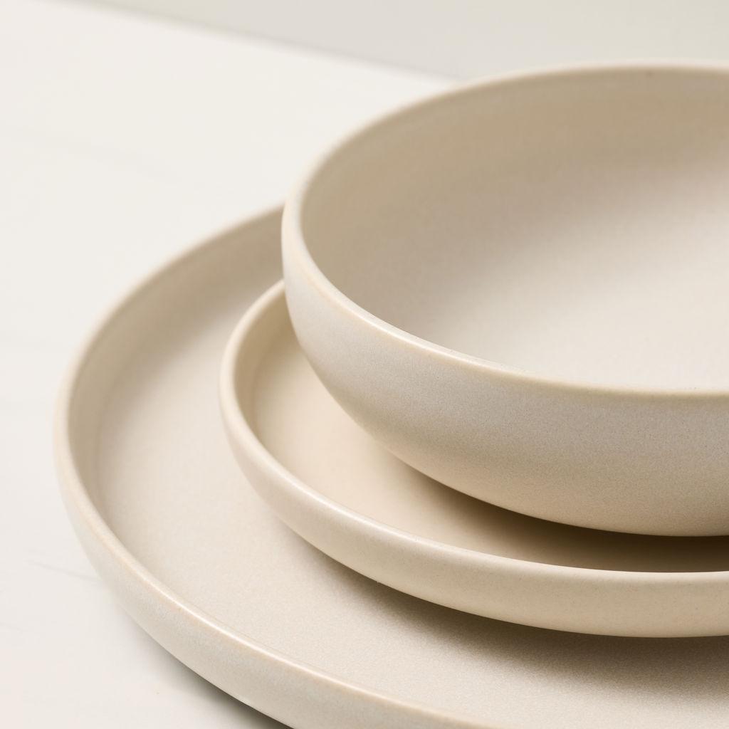 Stoneware is ceramic tableware made from clay fired at high temperatures until it reaches a glass-like consistency, resulting in a durable, stone-like appearance.