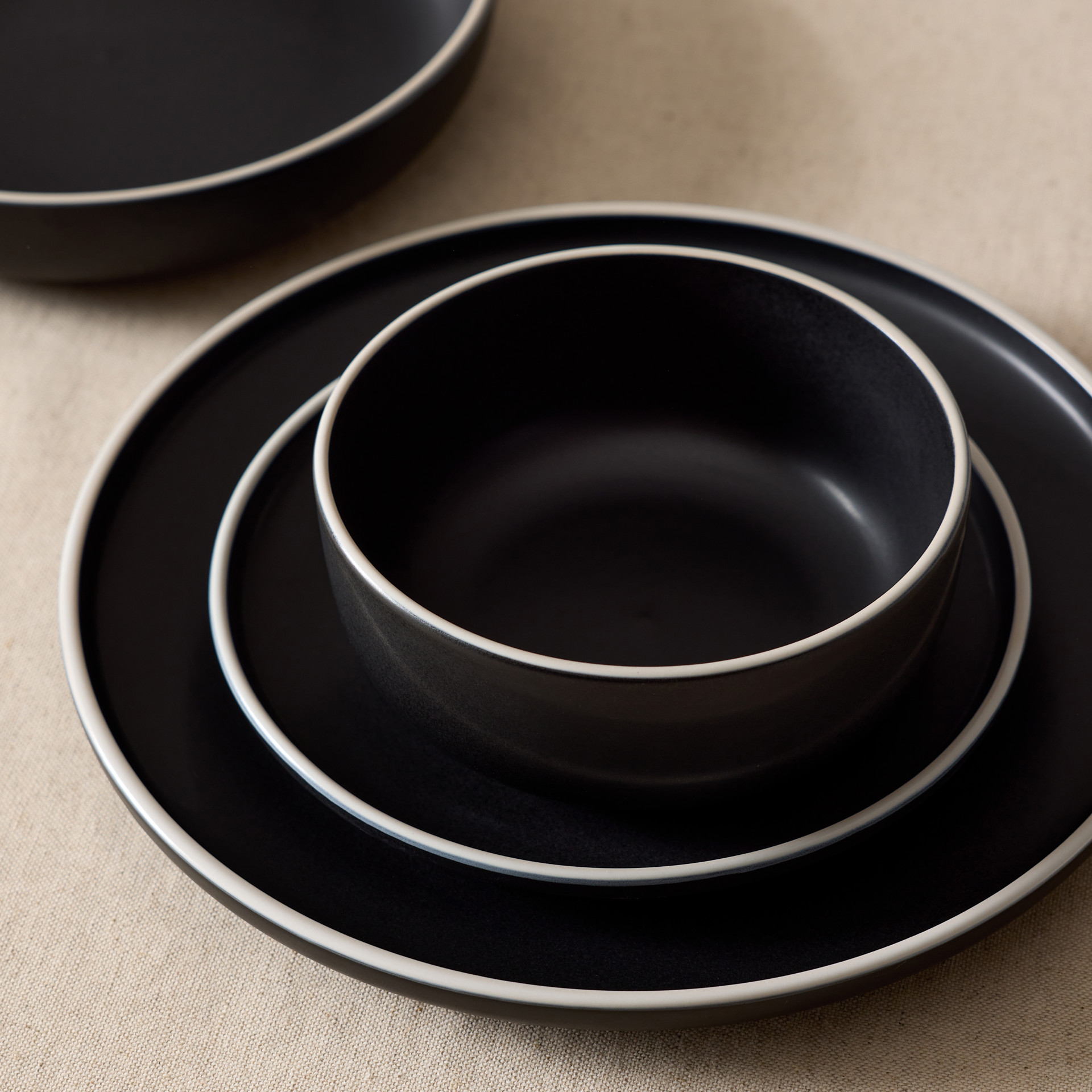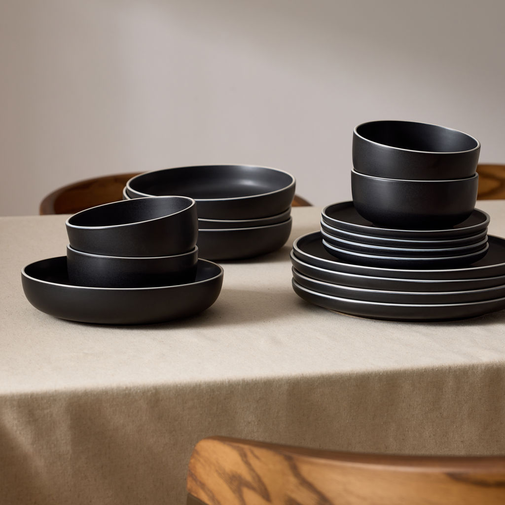 This 16-piece black porcelain set includes: