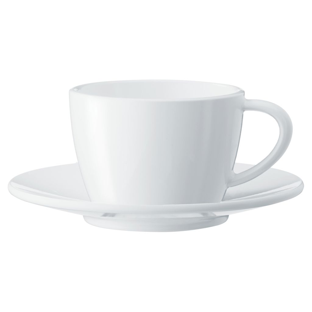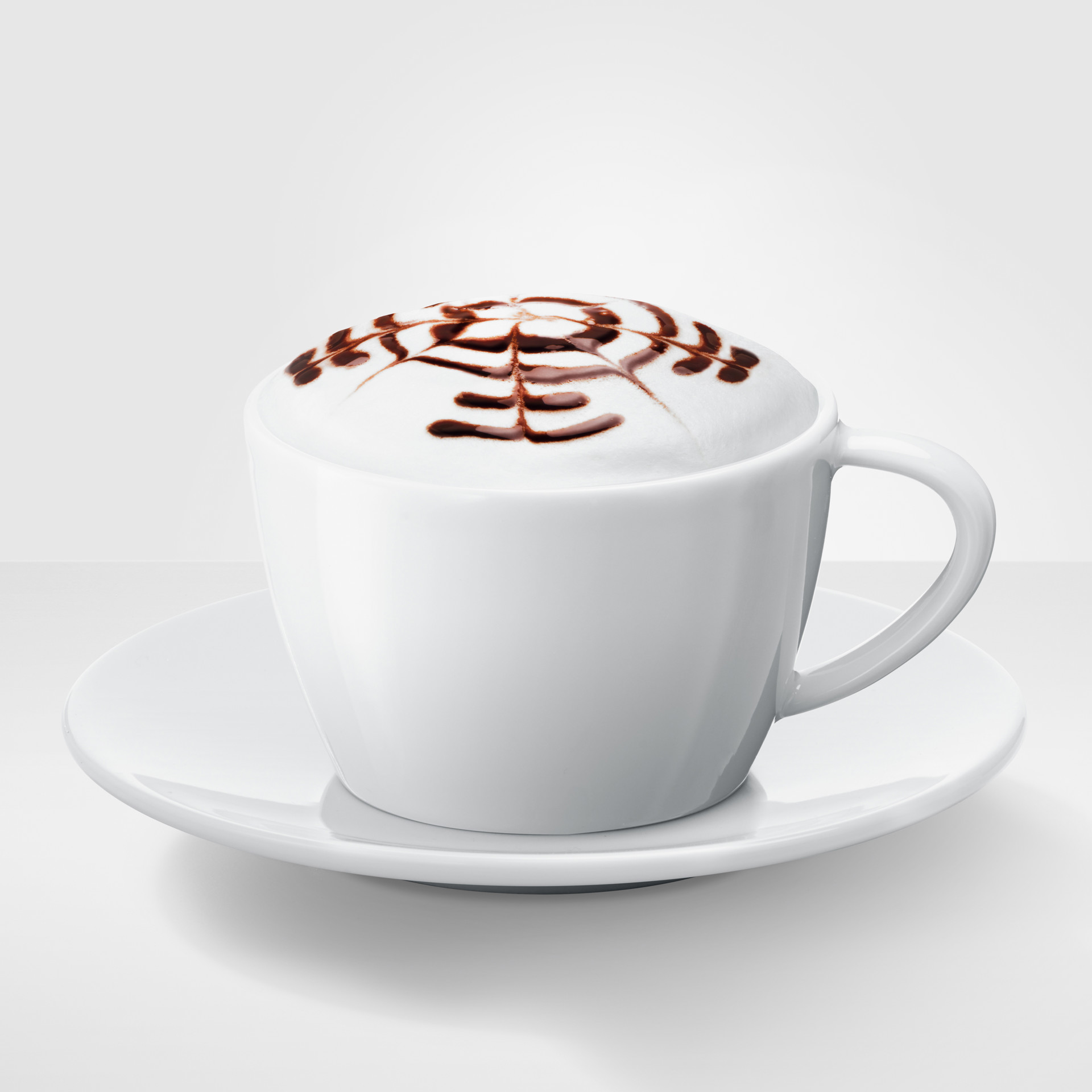 A fine espresso topped with airy milk foam and decorated with cocoa powder, chocolate sauce, or latte art by the barista, a delight for both the palate and the eyes. Showcase your creation with this elegant white porcelain cappuccino cup.