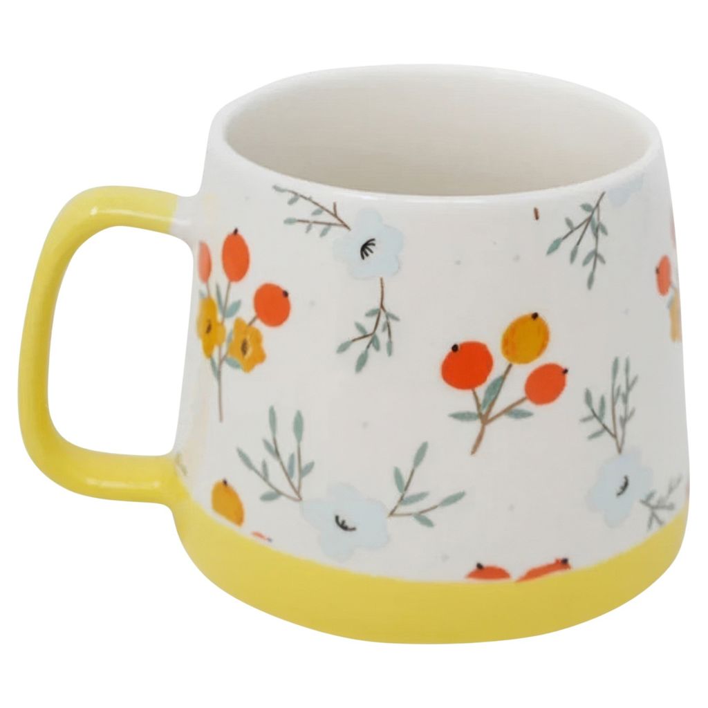 This ceramic mug features a delicate floral pattern in vibrant colors, adding a fresh touch to your coffee or tea breaks. Its yellow base and handle bring a sunny and warm feel