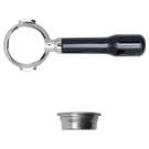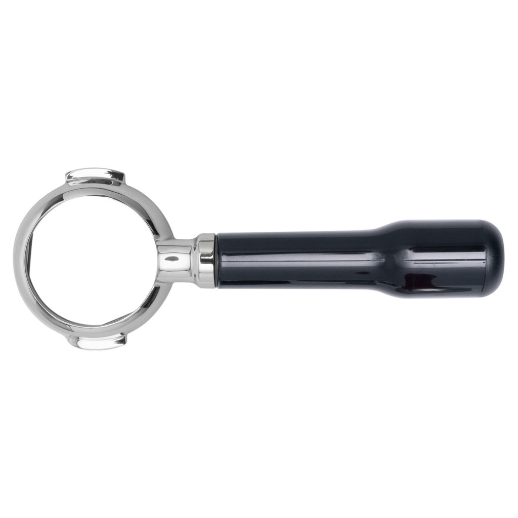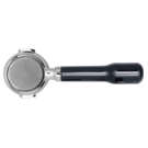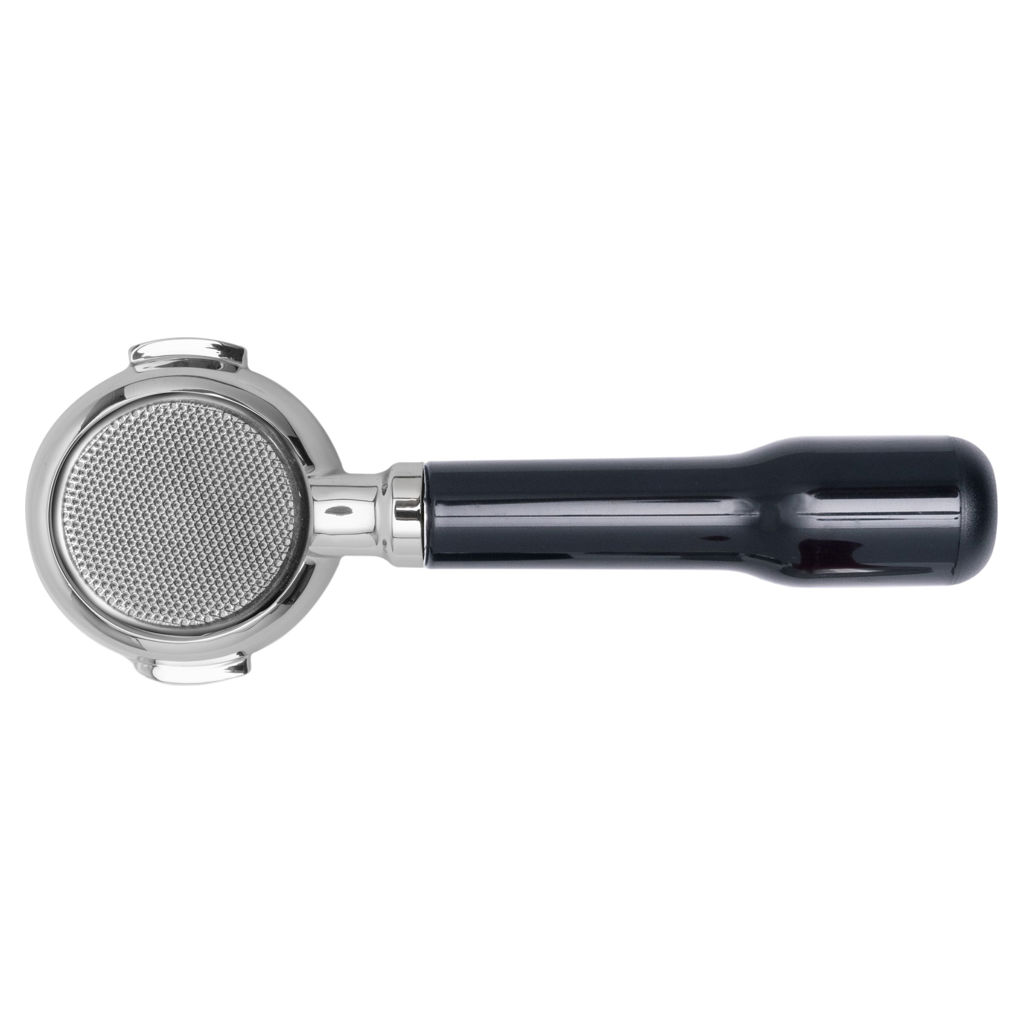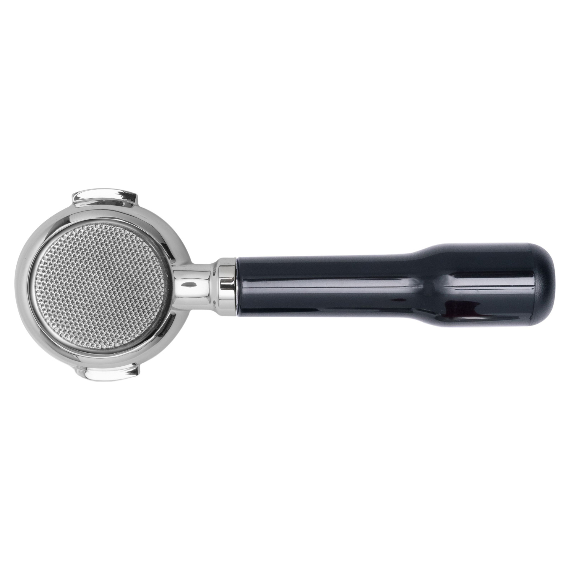 58mm stainless steel bottomless portafilter with classic black slanted handle.