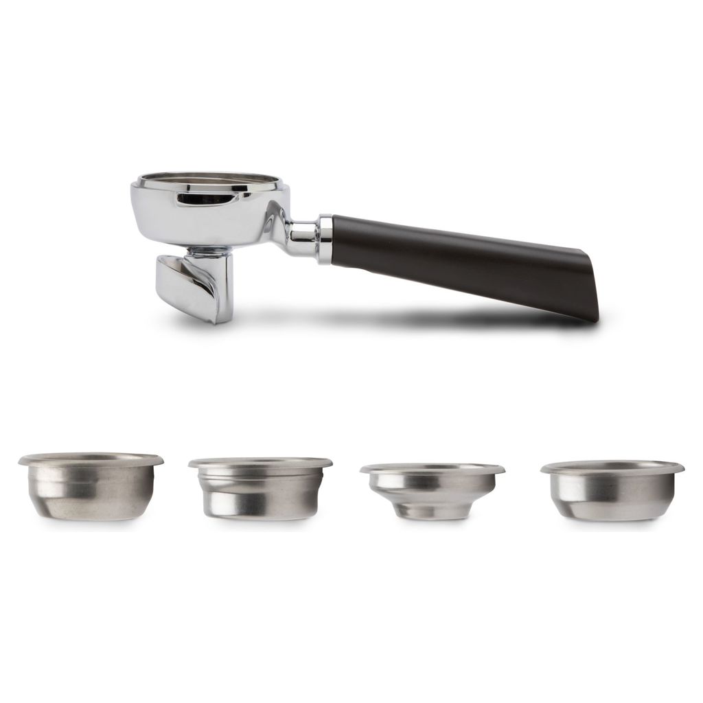 a 58mm stainless steel filter holder without bottom with classic black sloping handle a 58mm 3 dose (18-21 gr) stainless steel filter