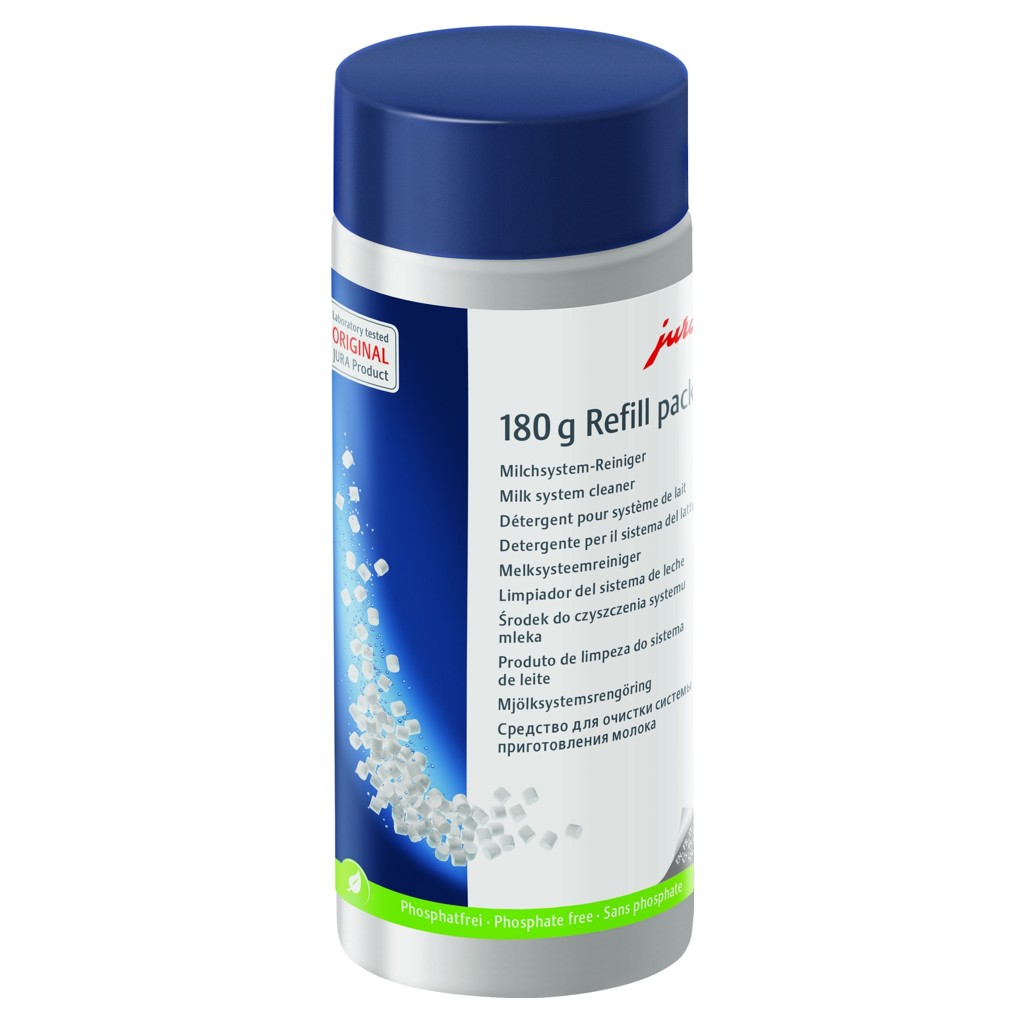 In combination with the automatic cleaning program, the mini-tabs effectively remove milk proteins and fats. JURA milk system detergent ensures hygiene and cleanliness of the pipes and guarantees a consistently fine, light and creamy milk foam.
