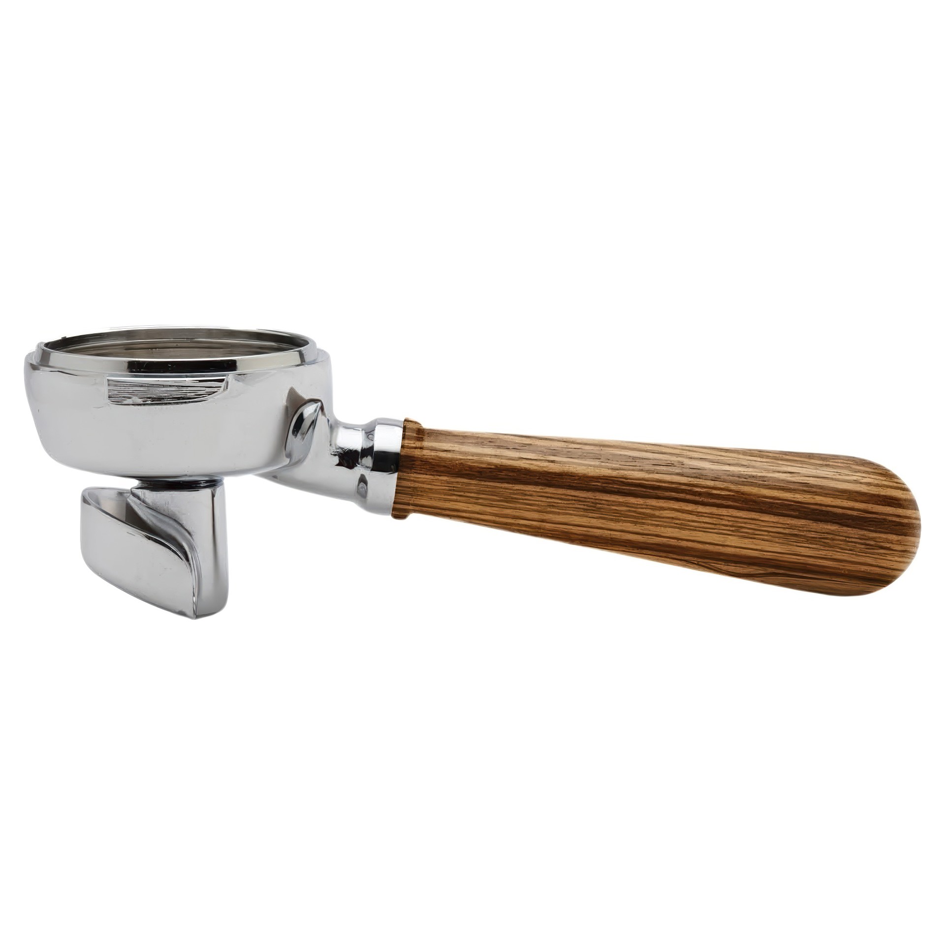 Bottomless stainless steel 58mm portafilter with double spout and angled walnut wood handle line.