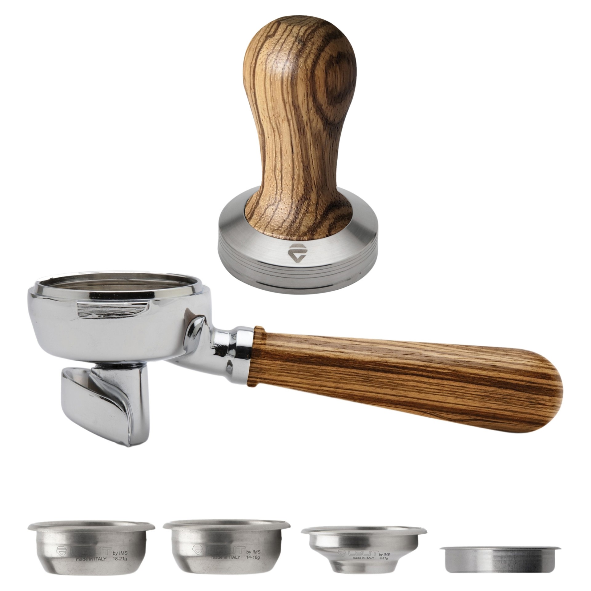 WOOD Line stainless steel 2-outlet 58mm portafilter with Coffee Slide outlet and slanted walnut wood handle 4 stainless steel 58mm filter.