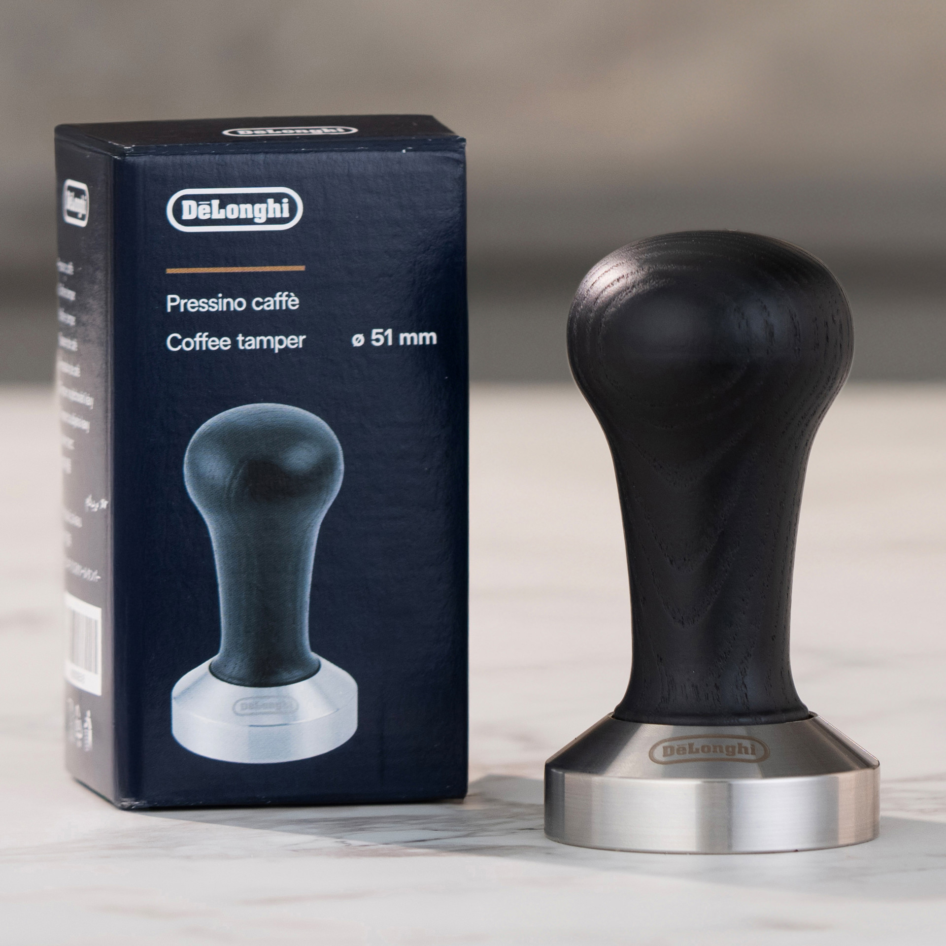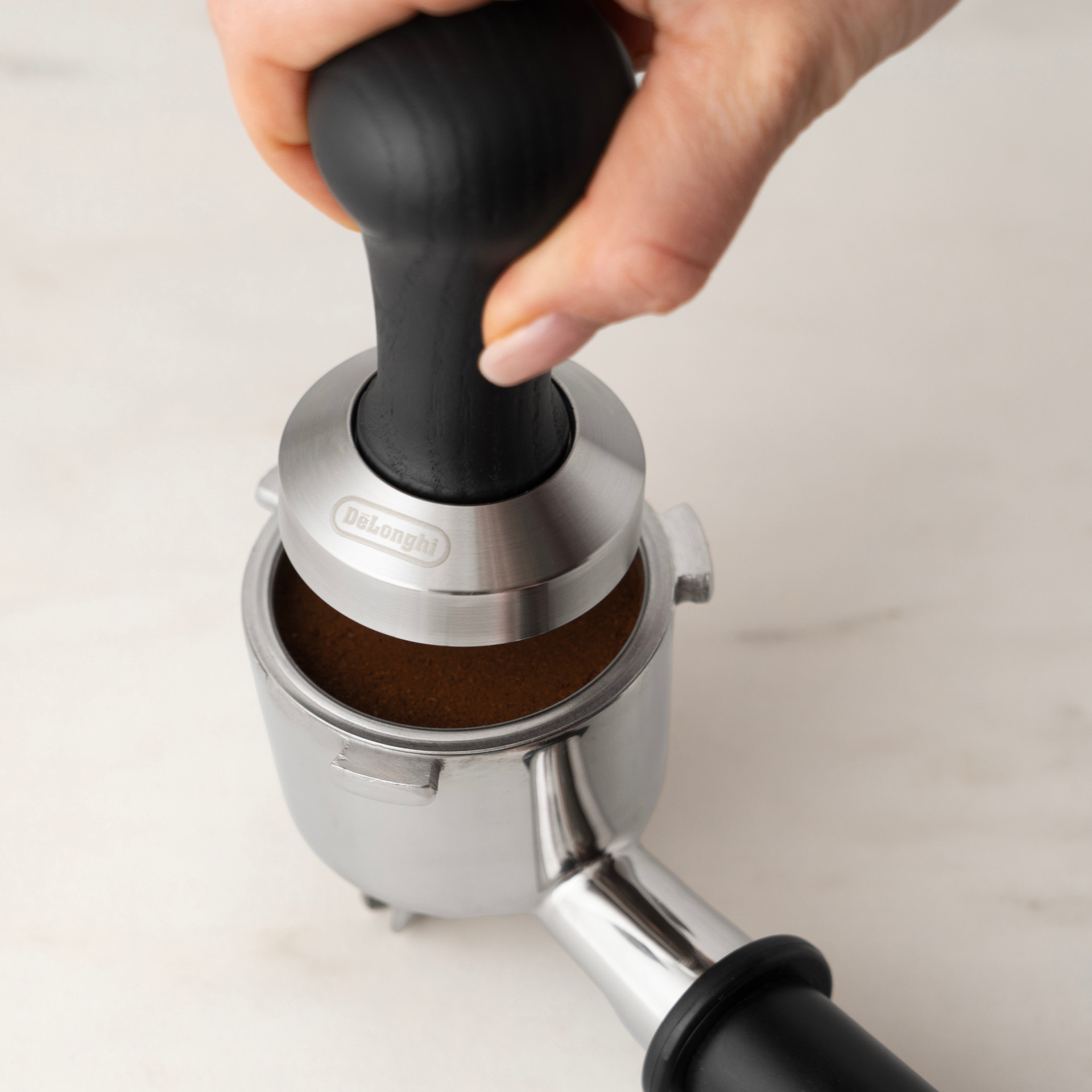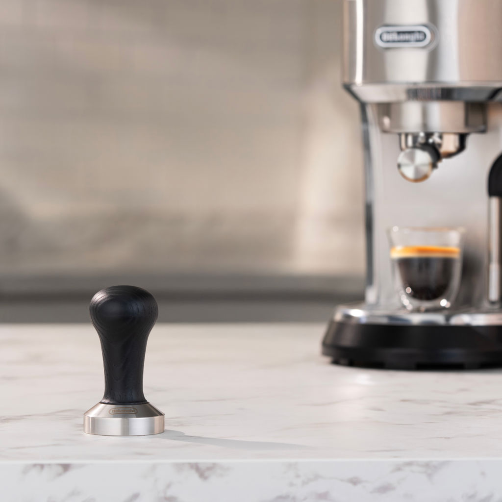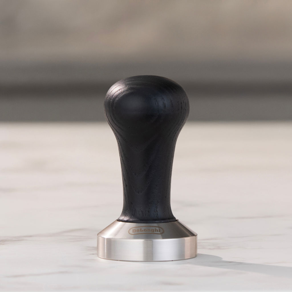This DeLonghi black wooden tamper has the ideal weight to evenly pack the ground coffee and guarantee uniform preparation, infusion after infusion.