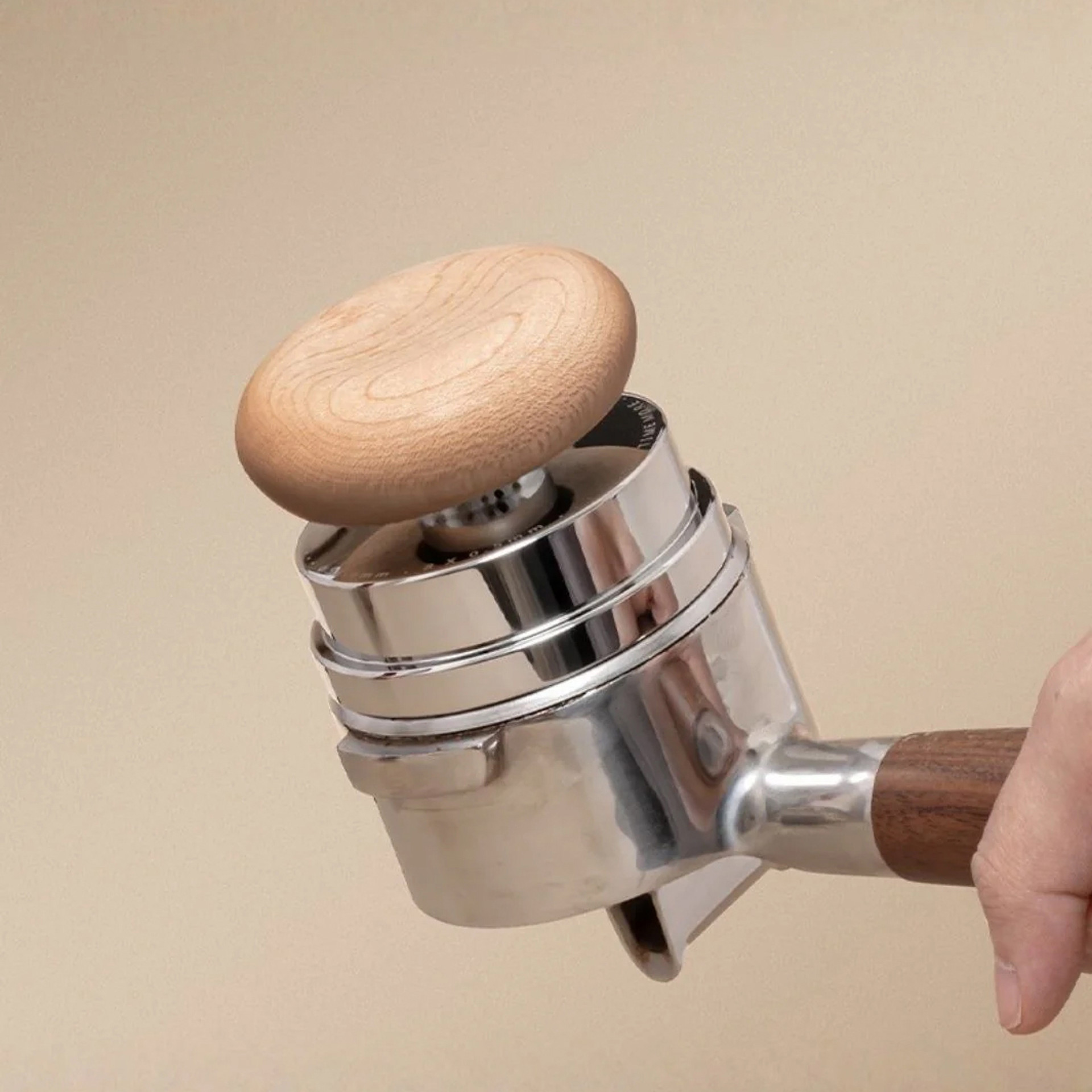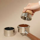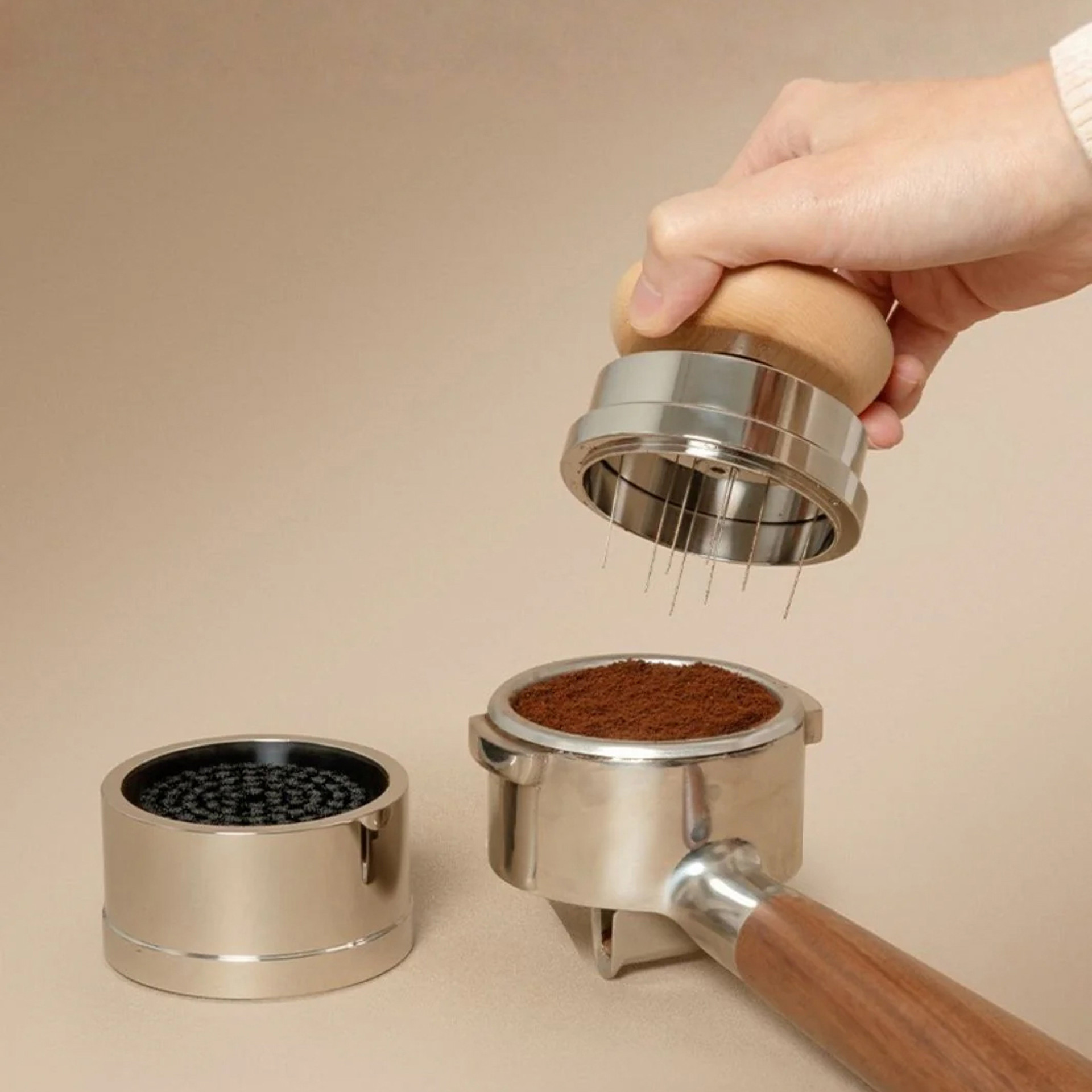 The Timemore PUCKS Orbital Needle Distributor (WDT) is the first essential tool for preparing an even coffee bed. It evenly breaks up and distributes the large amount of ground coffee into an airy, uniform layer free of clumps.