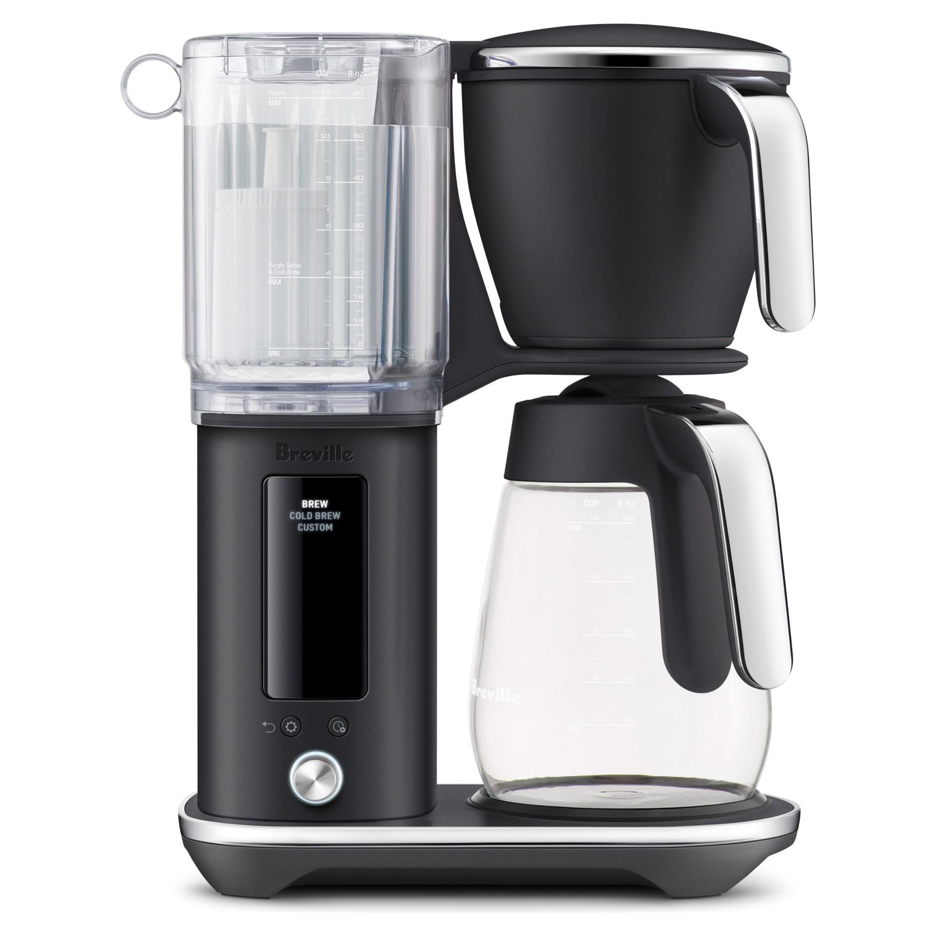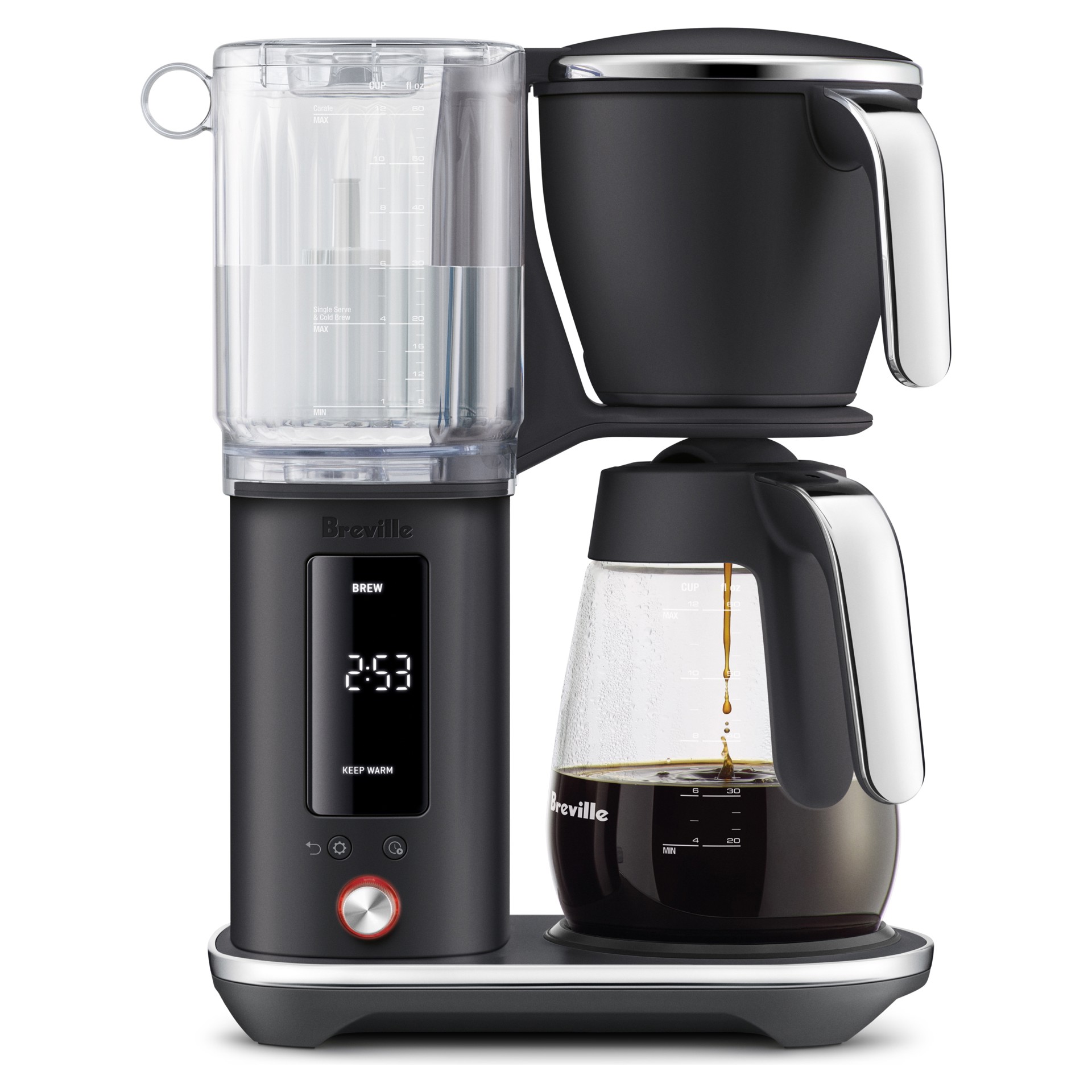 Large 12-cup removable tank with built-in Claro Swiss water filter and measurement lines. The wide opening makes refilling quick and splash-free.