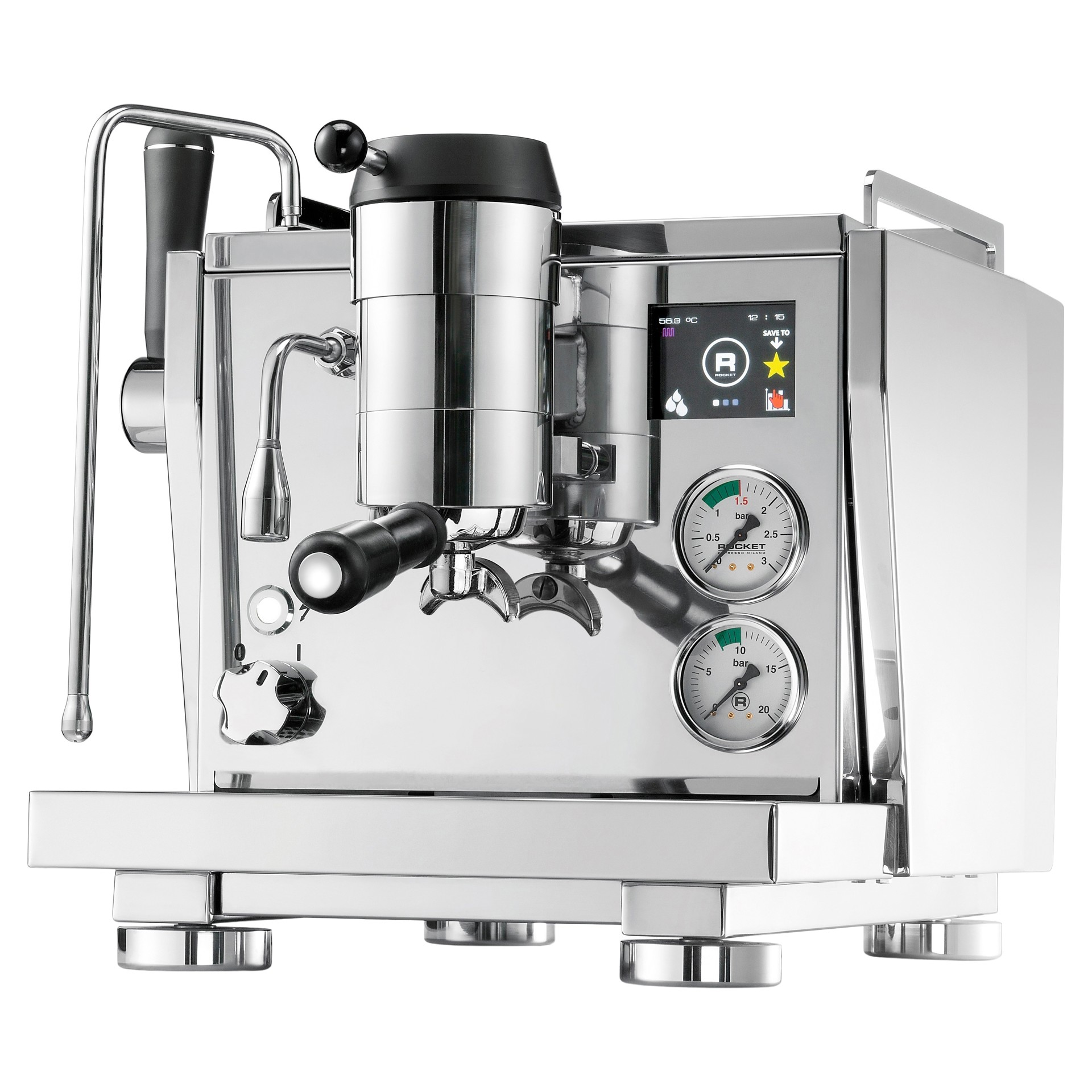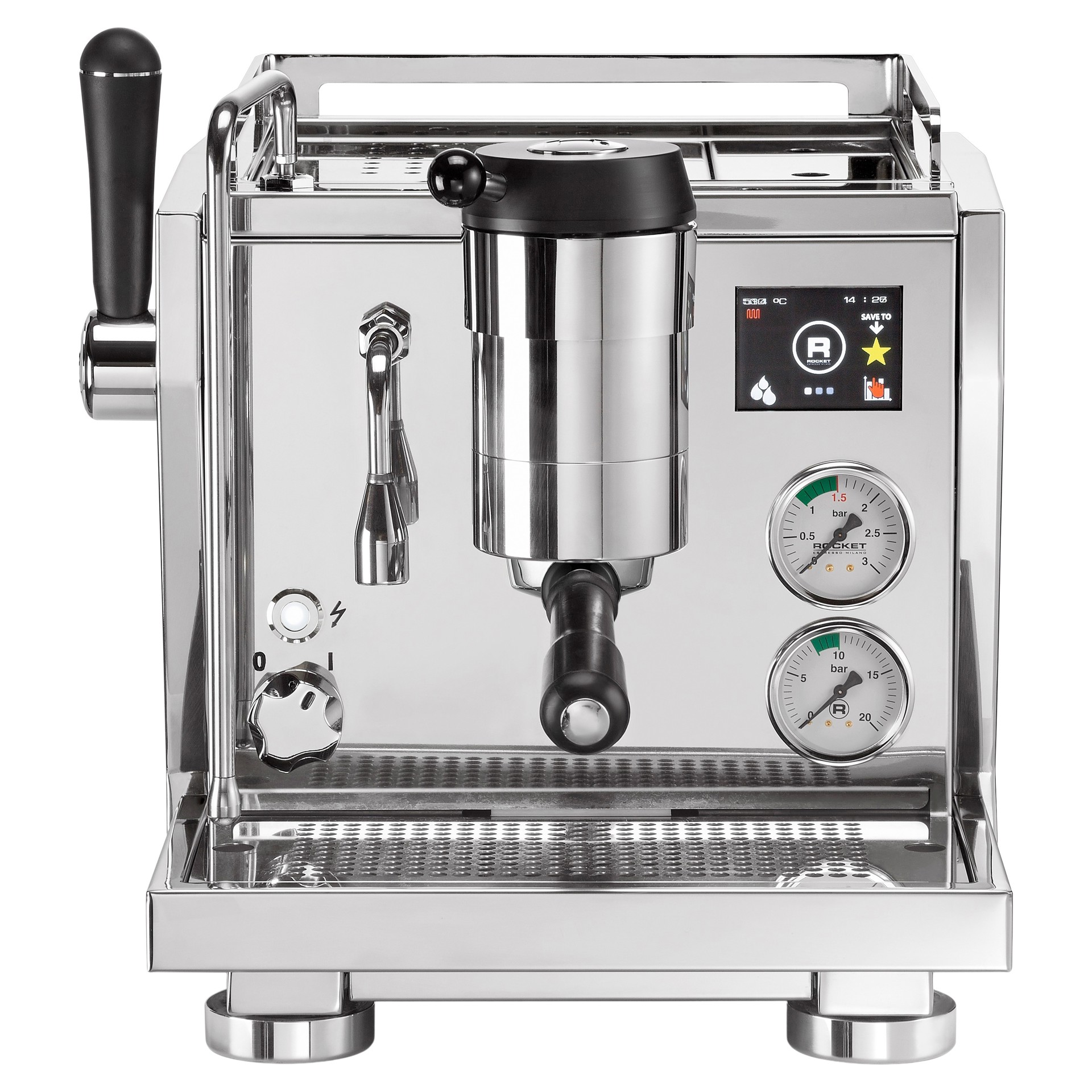 Pre-infusion and post-infusion are managed via a full pressure profiling system, using five preset programs or manually through the Rocket Espresso paddle system.