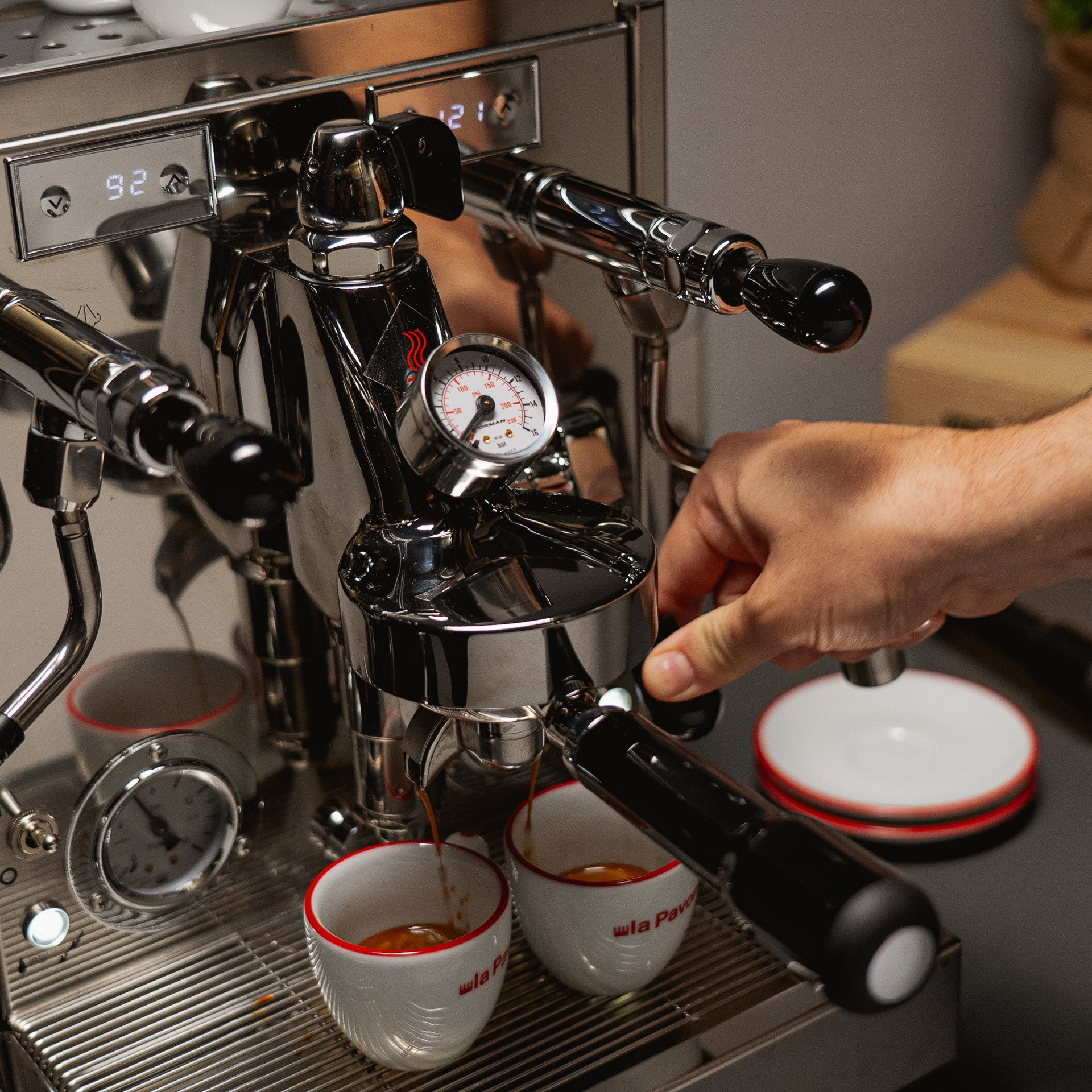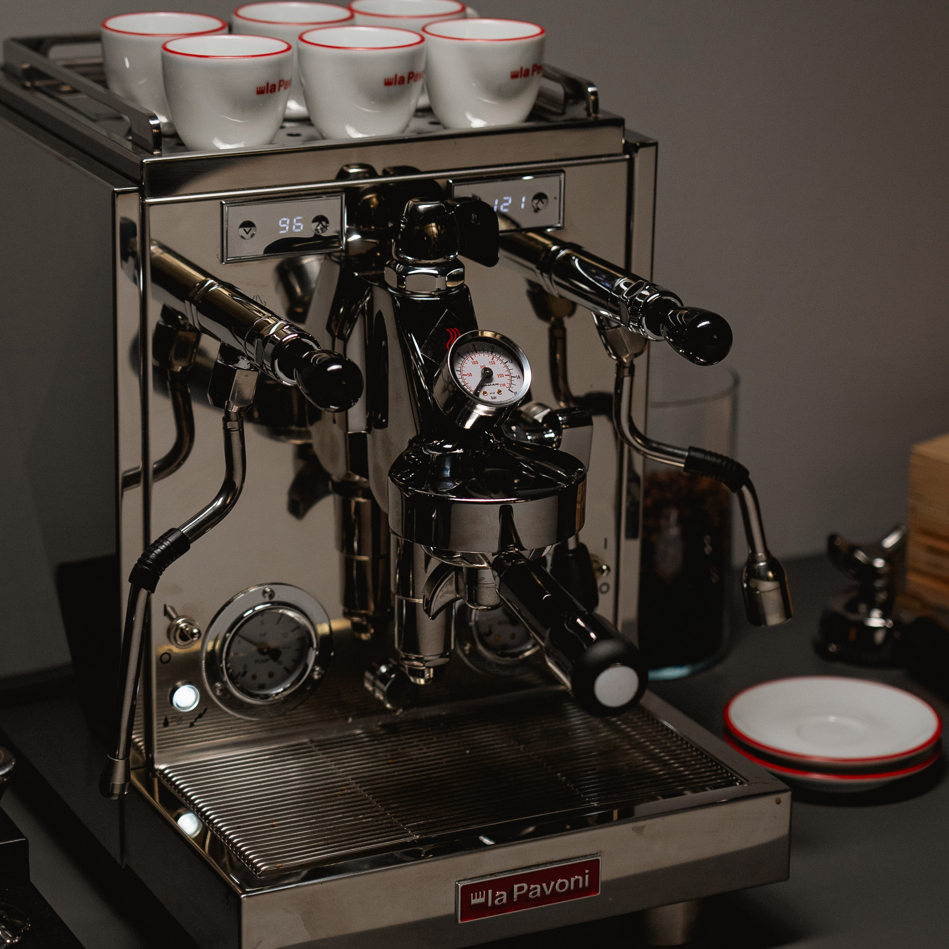 • Three pressure gauges: one for each boiler (brew and steam) and one on the E61 group itself, allowing you to monitor actual pressure on the coffee puck for precise extractions