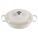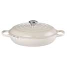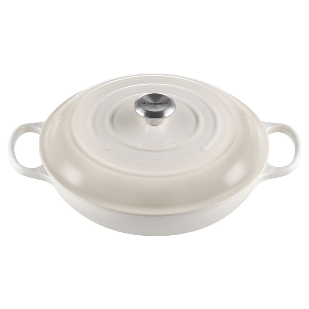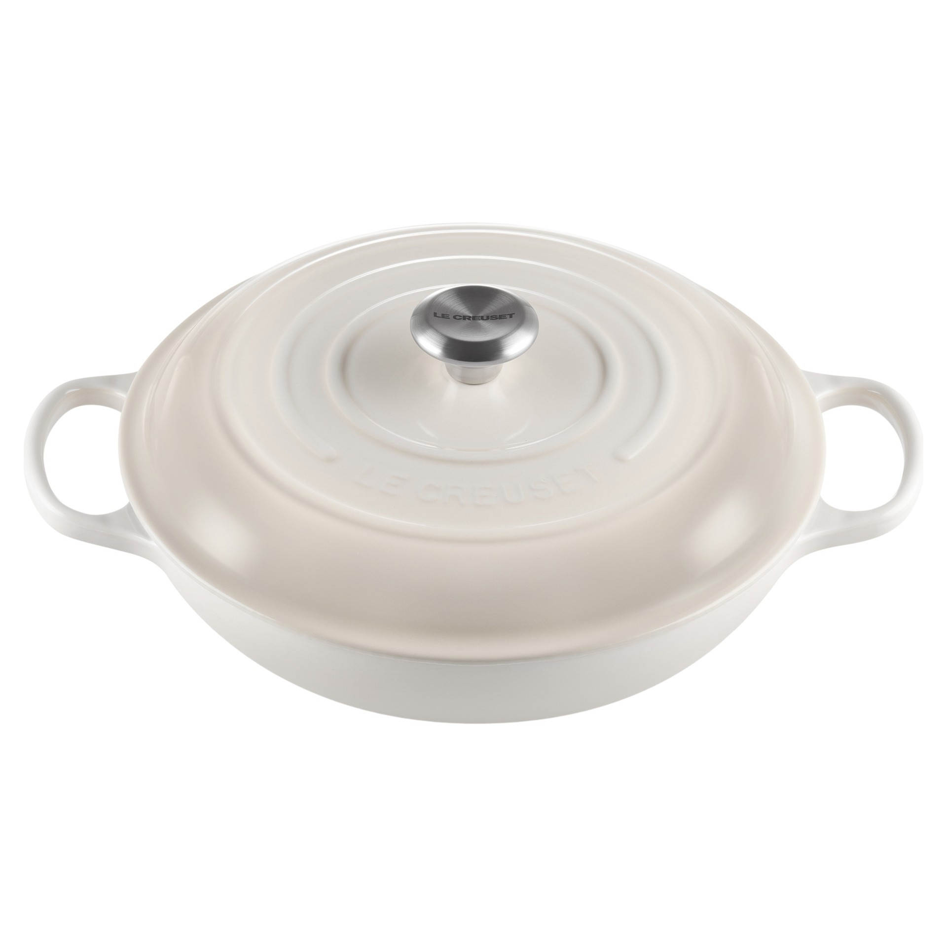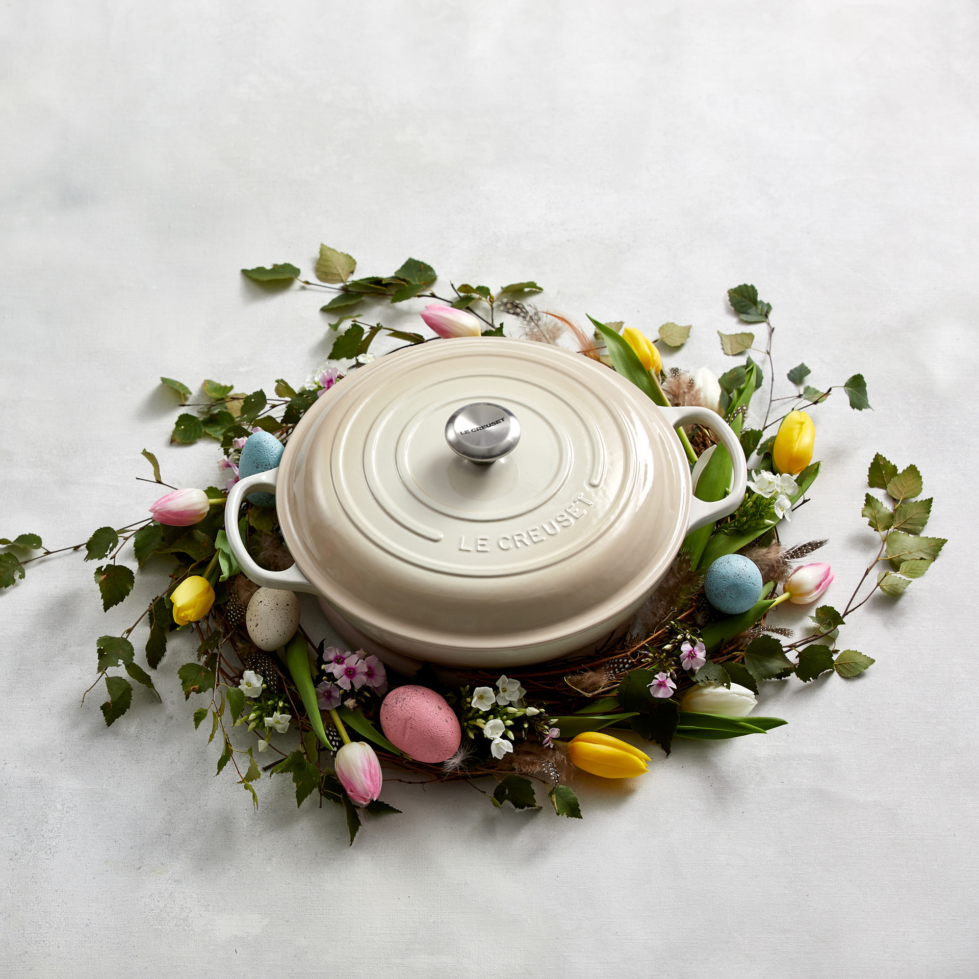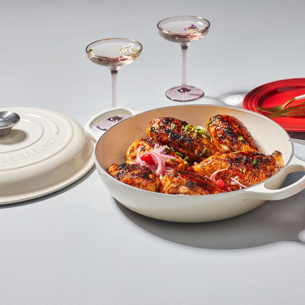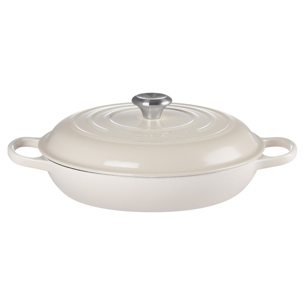 Le Creuset enameled cast iron Braiser is uniquely designed to provide steady, even heat to transform tough cuts of meat and hearty vegetables into tender, flavorful dishes. The wide base allows ingredients to be placed in a single layer for searing without crowding; once liquid is added, the domed lid circulates steam to lock in moisture and flavor.