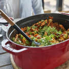 This large oval Dutch oven is perfect for dinner parties, ideal for braising whole roasts or cooking chicken and duck.