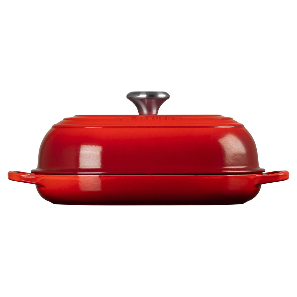 The domed lid traps and circulates steam for maximum rise and enhanced flavor, while the low-profile base promotes even browning and a golden, crispy crust.