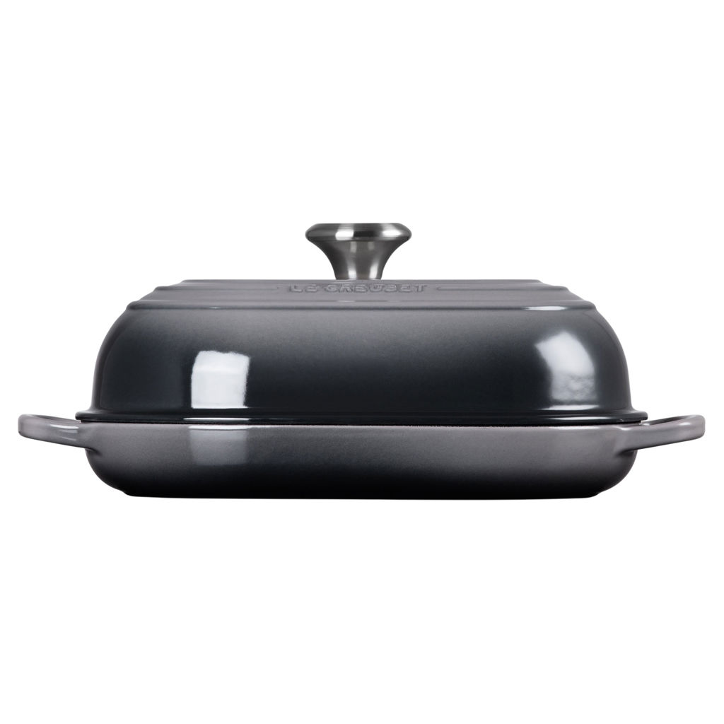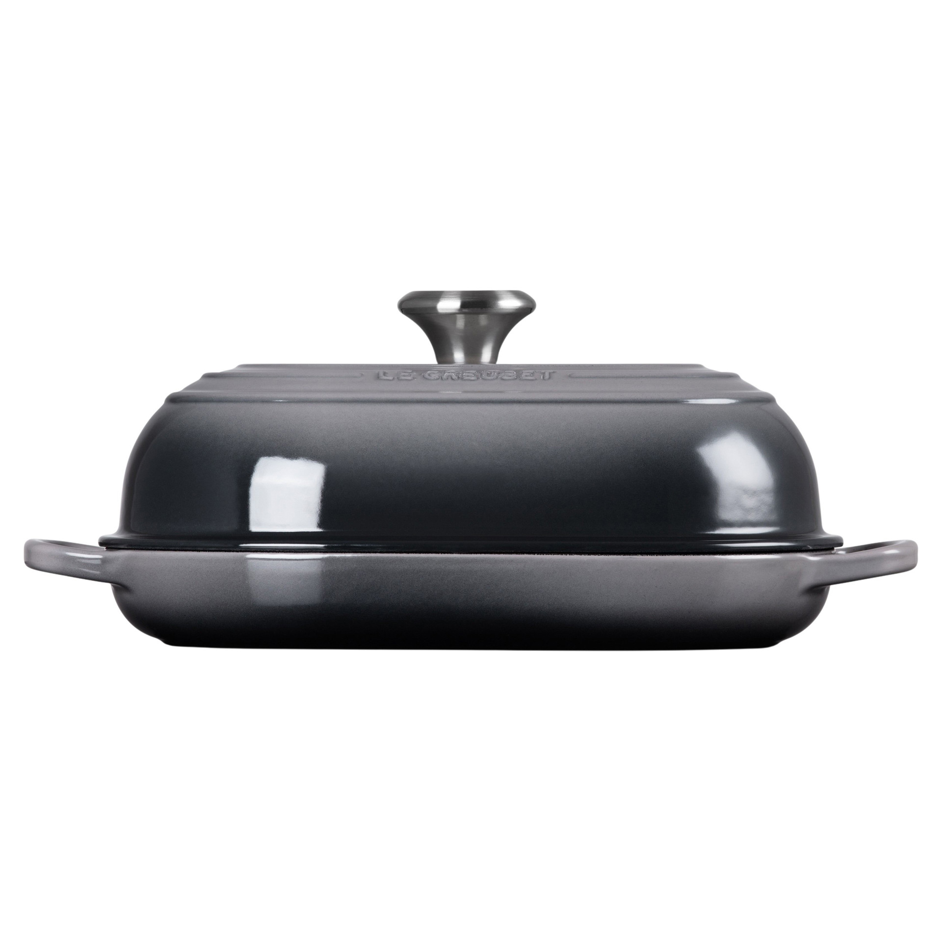 The domed lid traps and circulates steam for maximum rise and enhanced flavor, while the low-profile base promotes even browning and a golden, crispy crust.