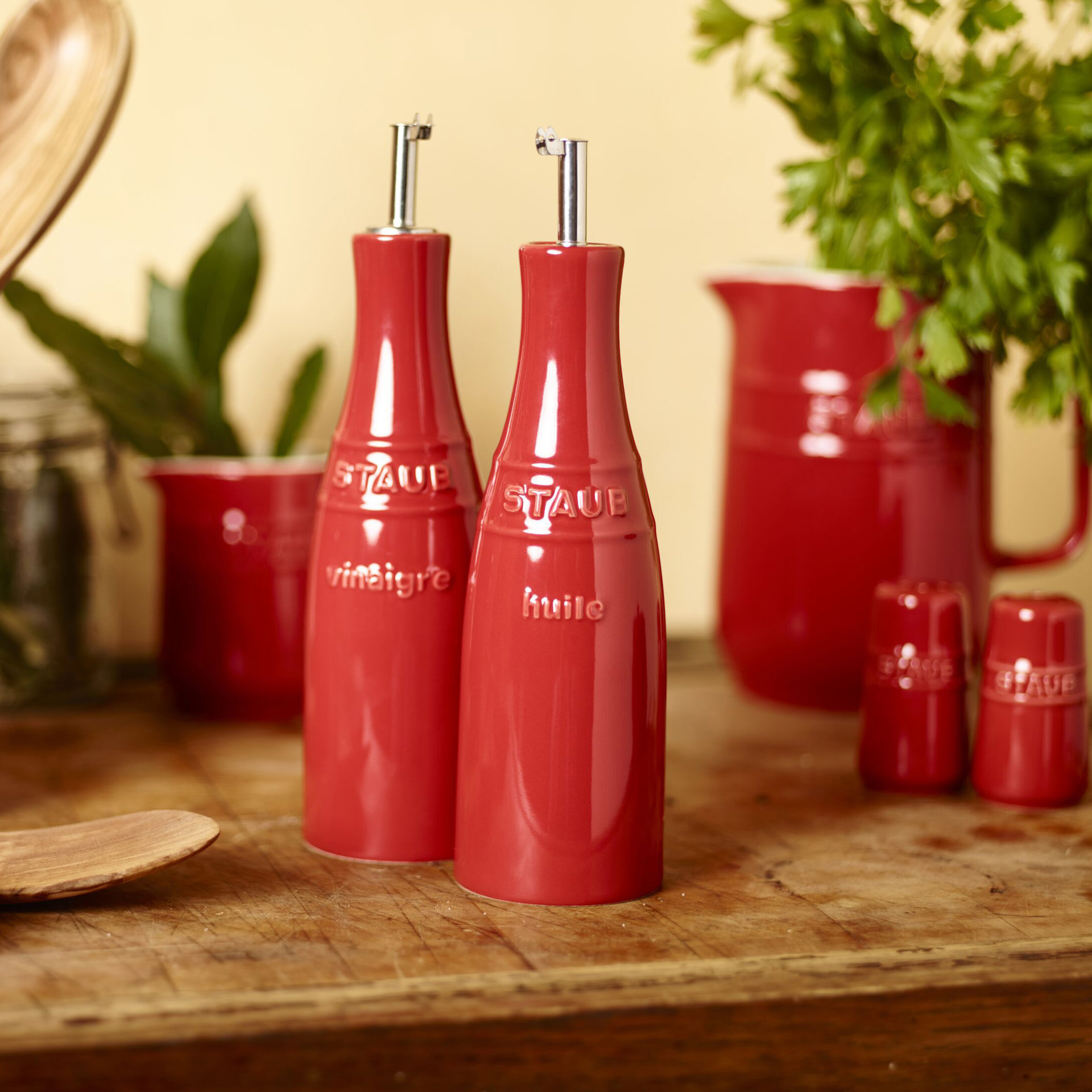 This Staub Ceramics oil and vinegar set is a true centerpiece for your kitchen.