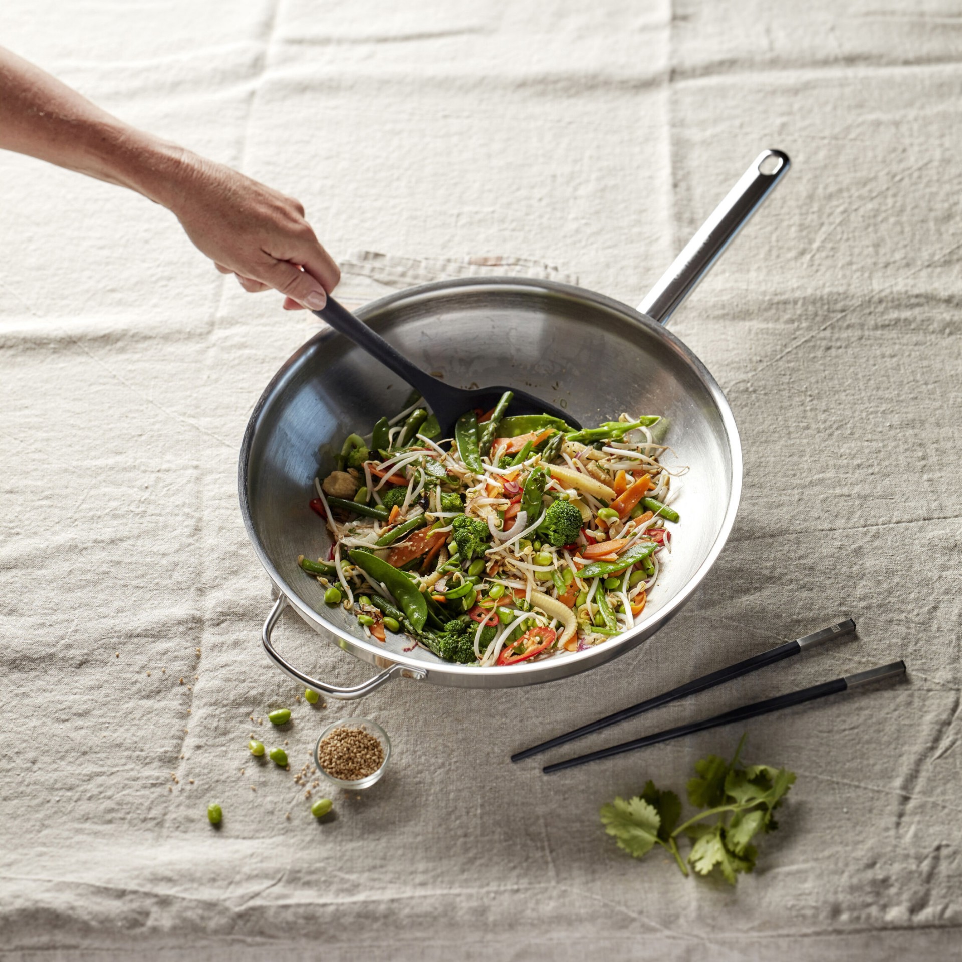 The ZWILLING Special Plus 32 cm / 12.5" stainless steel wok, with its 5-ply construction, delivers exceptional cooking performance: the 18/10 stainless steel interior ensures maximum stain resistance and prevents flavor transfer, while the 3-layer aluminum alloy core provides fast, even heat distribution for balanced cooking without hot spots. The magnetic stainless steel exterior ensures excellent performance with the latest induction cooktops. The long handle and helper handle are welded for easy handling and cleaning. Perfect for quick stir-fries and Asian-style cooking.