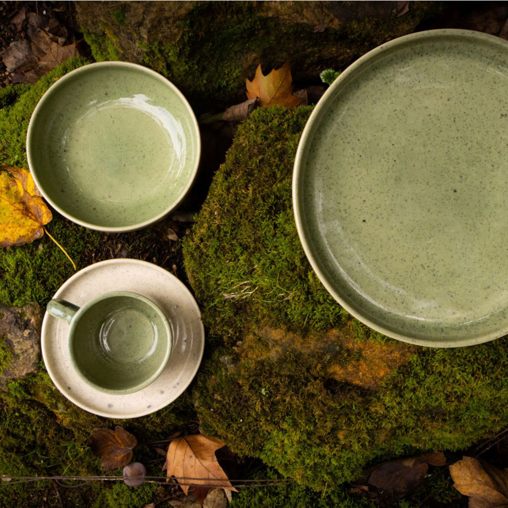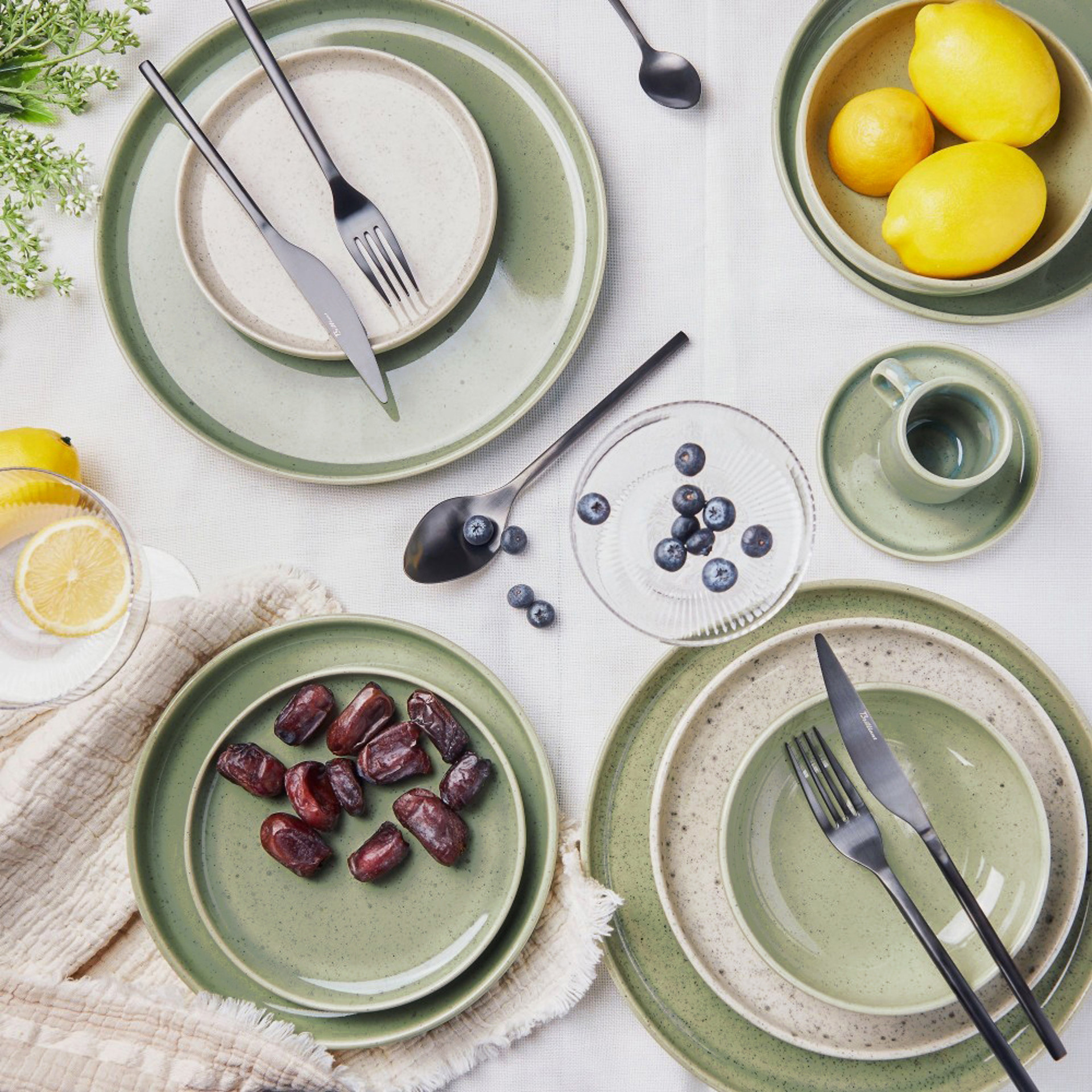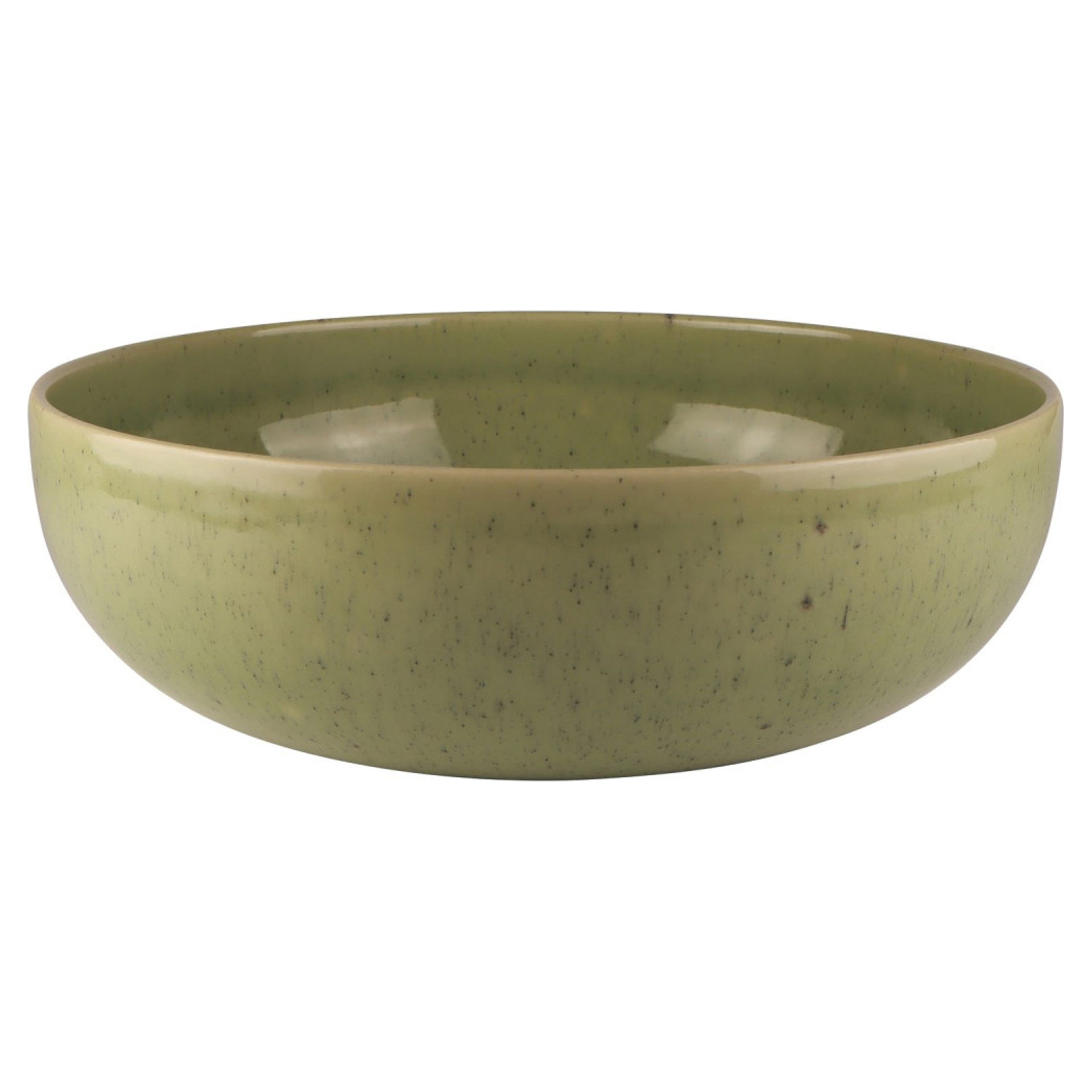 This salad bowl features a pleasant green tone that softly fades toward the rim and is accented with subtle black speckles.