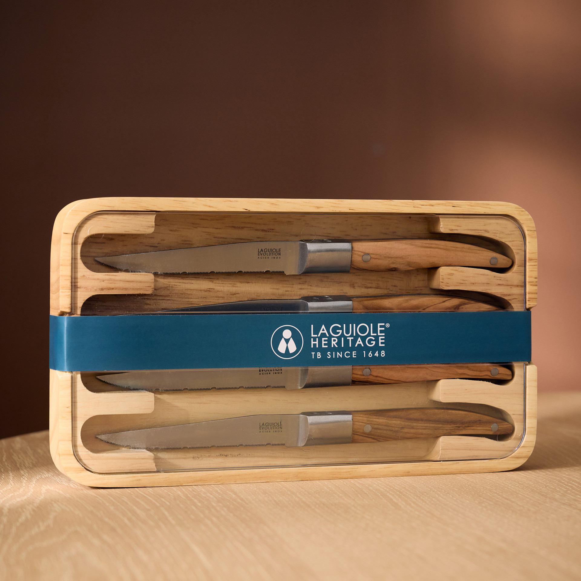 Featuring an elegant olive wood handle, this steak knife is part of the Laguiole Expression collection.