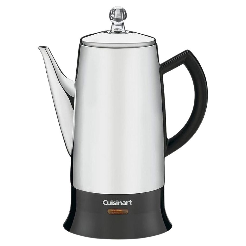 Cuisinart brings modern touches to traditional coffee-making techniques with the classic 12-cup percolator. This handsome stainless steel coffeemaker percolates hot water through the coffee grounds to the transparent knob on top, creating the familiar sound we all love.