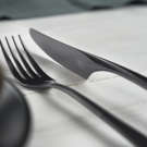 Modern and elegant, the Bellasera Black collection features a sleek black satin finish. The unique standing knife design adds a touch of elegance to your table.