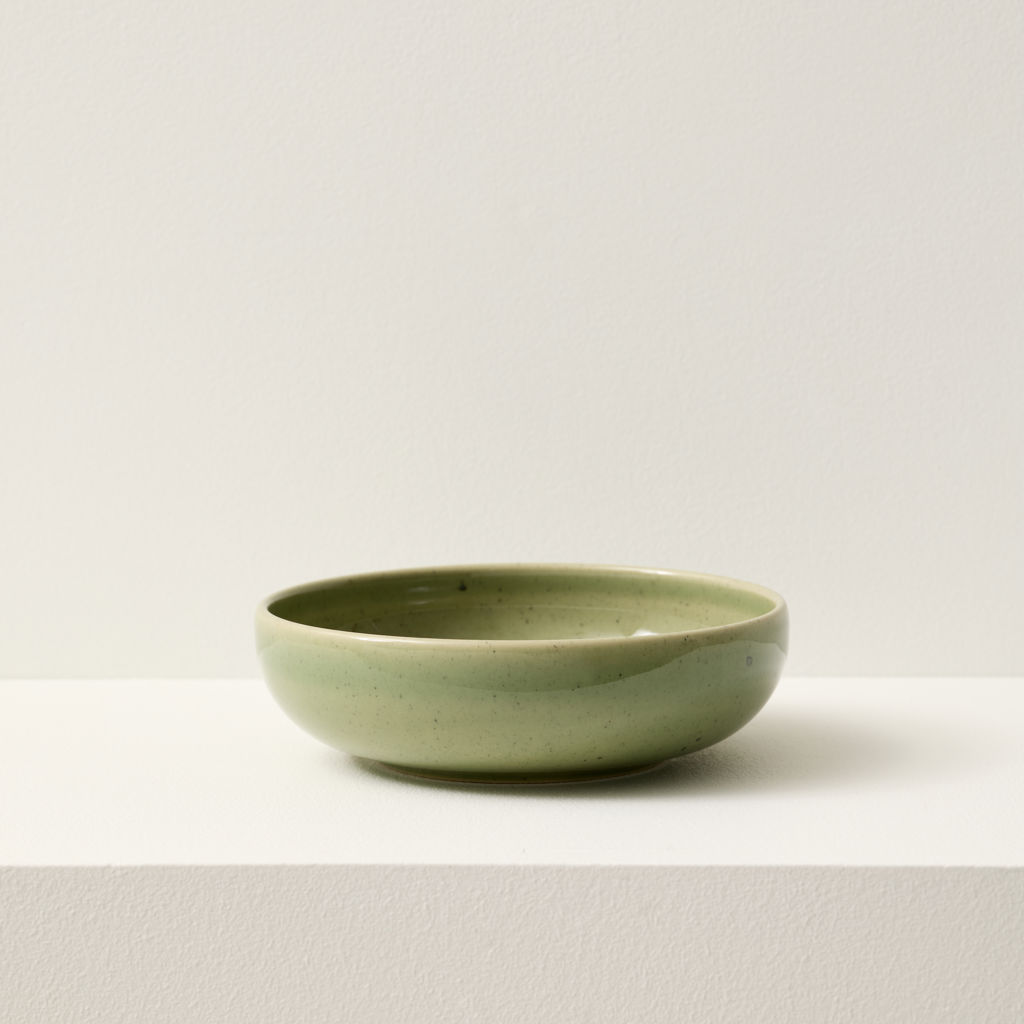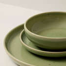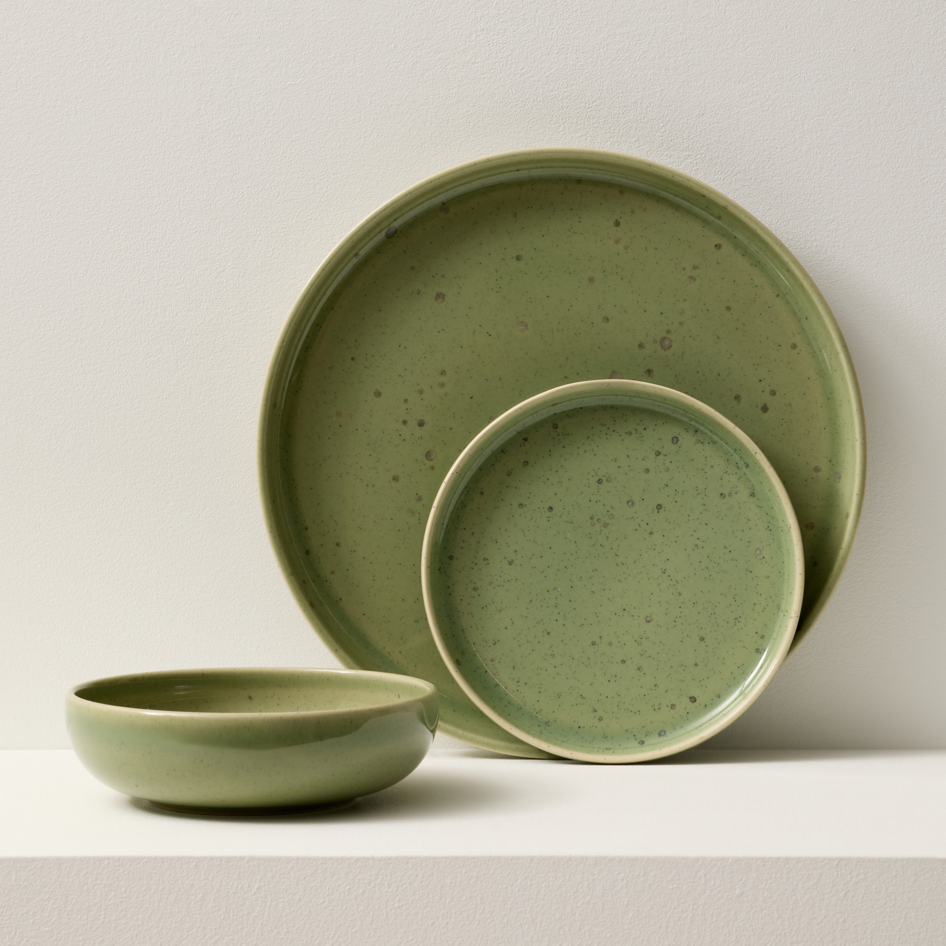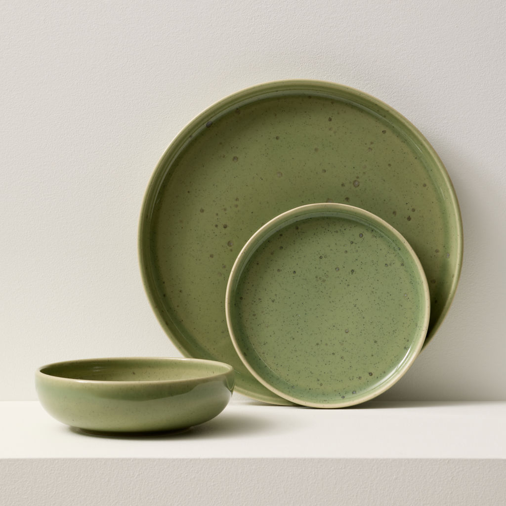 For a modern look, serve a variety of dishes with this 12-piece Uno Speckle Green stoneware set.