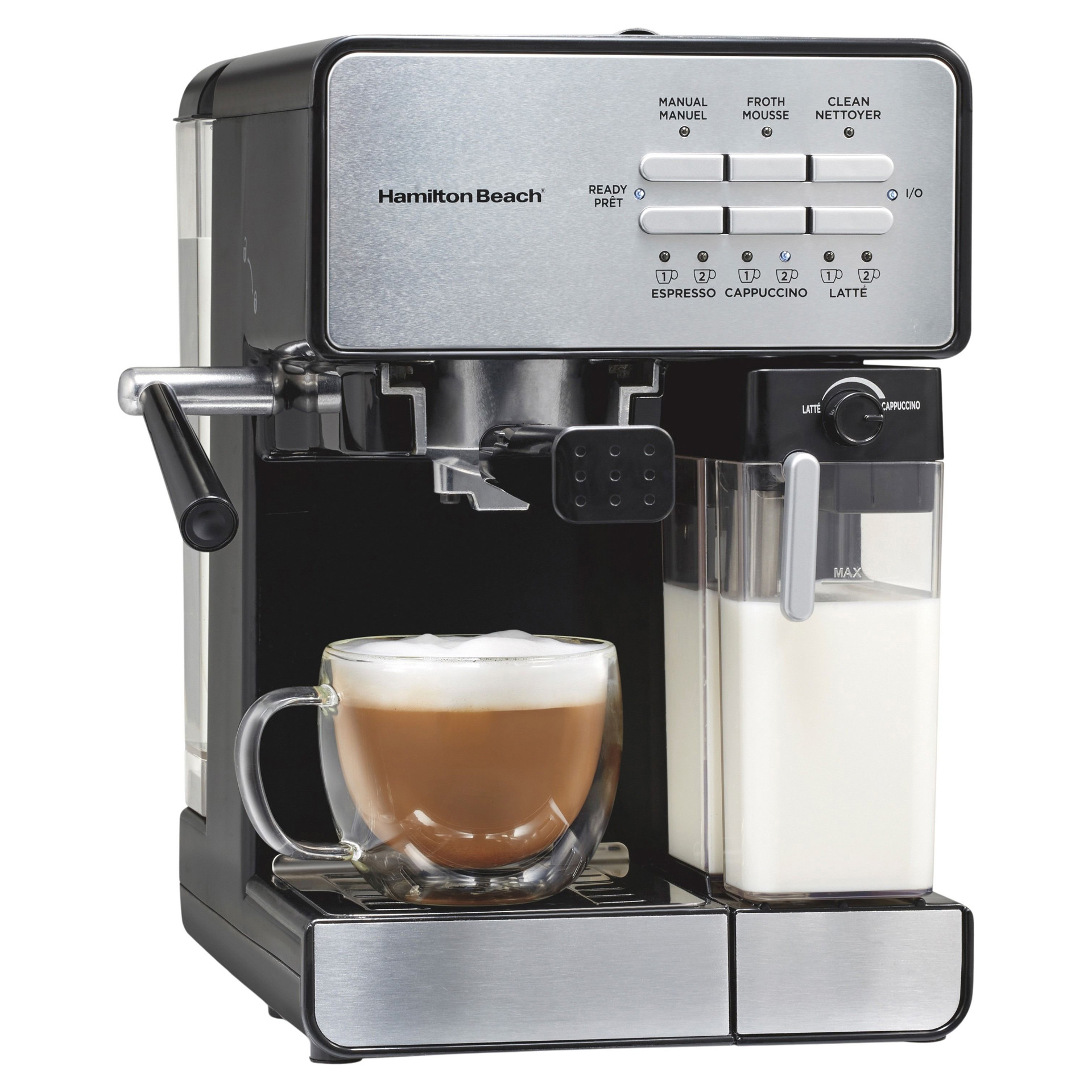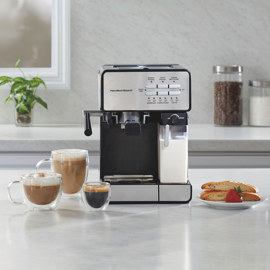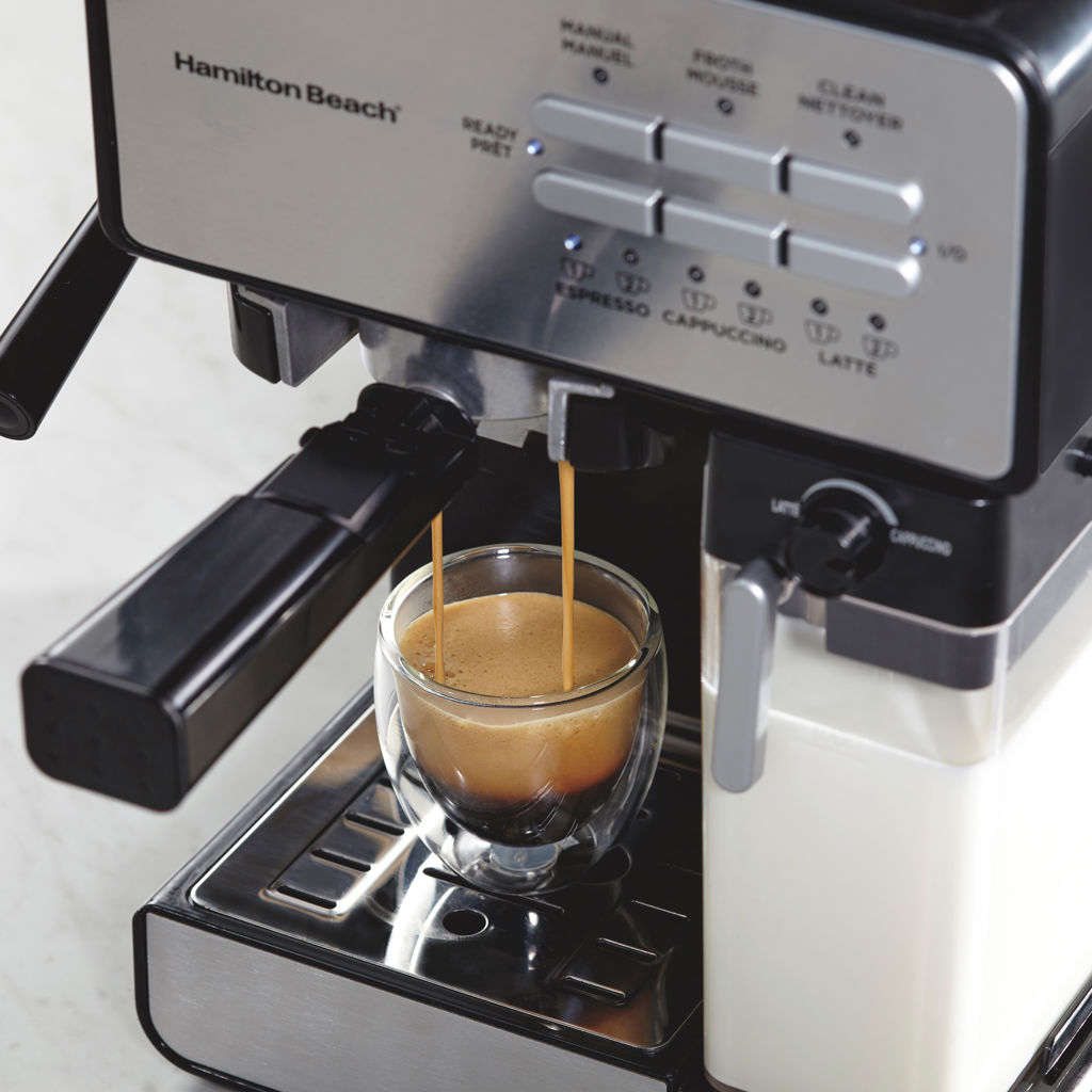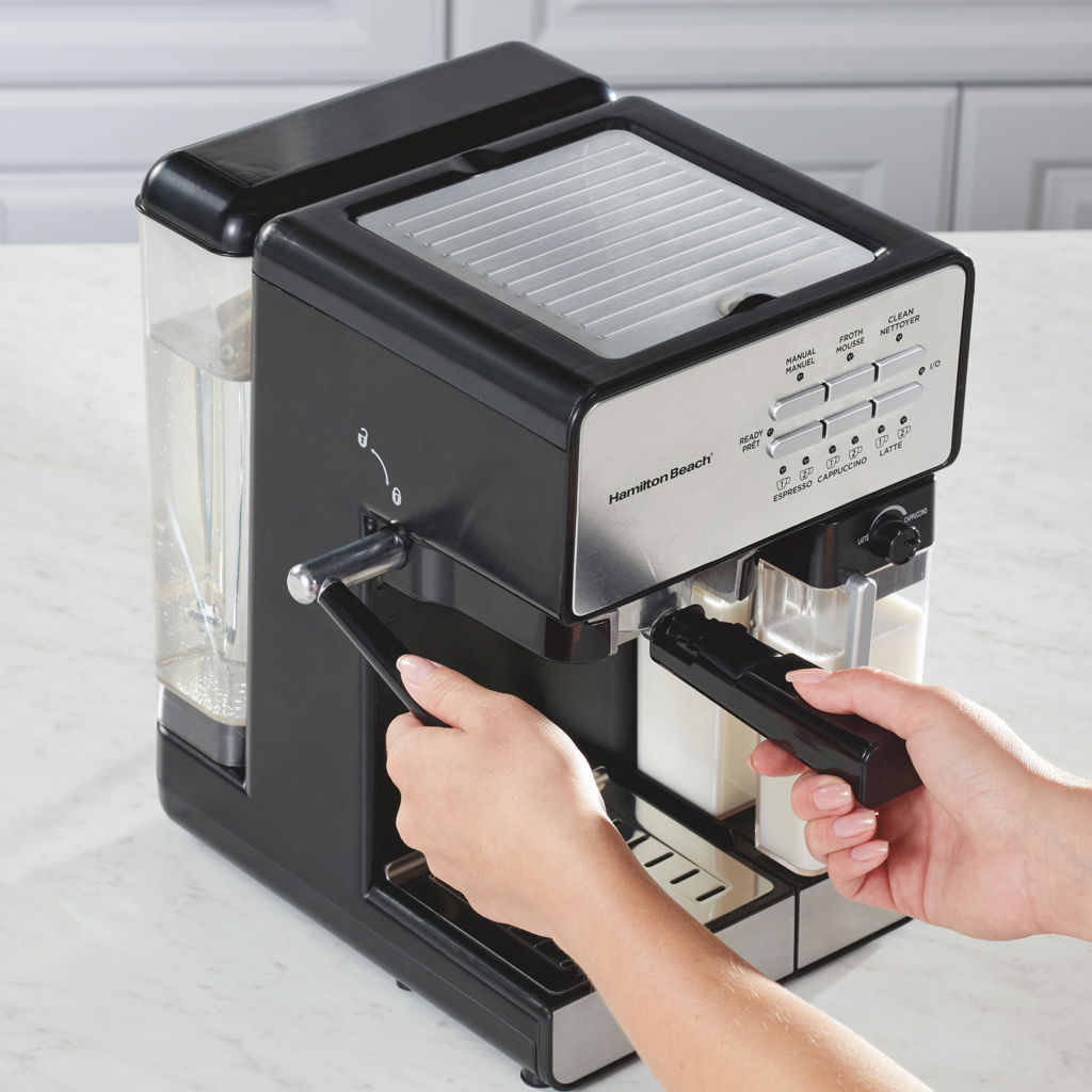 Brew barista-quality espressos, cappuccinos, and lattes, just like your favorite café. The Hamilton Beach® Slide & Lock™ Espresso Machine with Automatic Milk Reservoir makes it easy to prepare all three drinks.