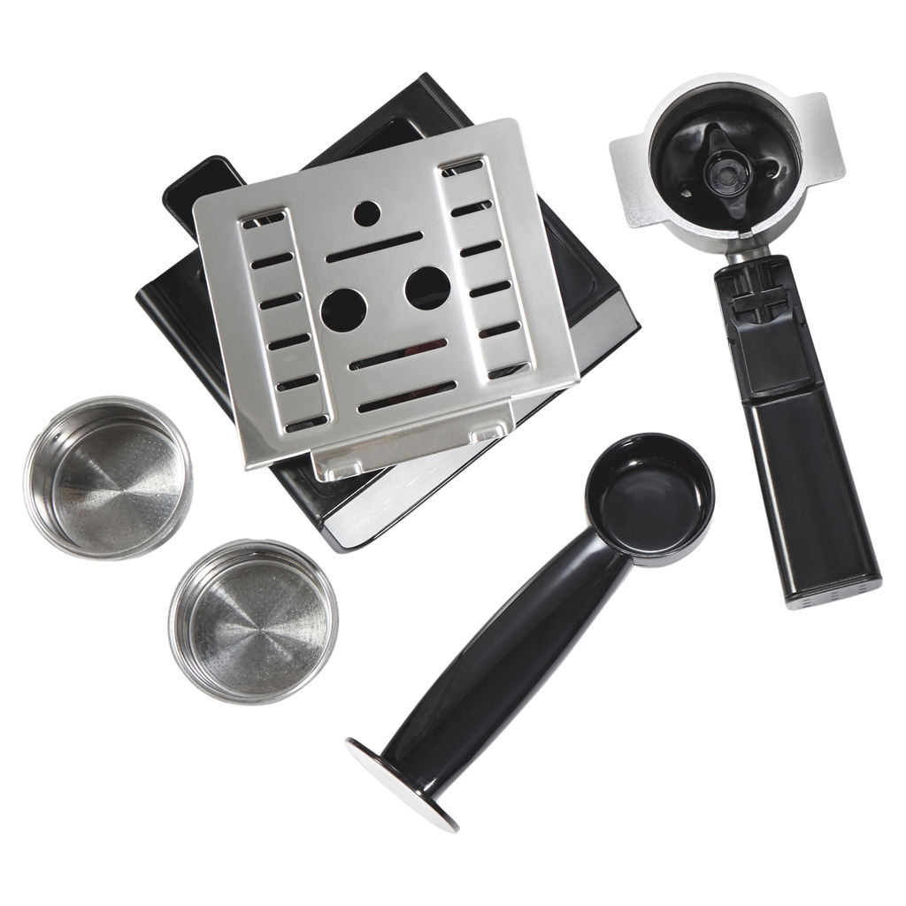 Portafilter, single and double stainless-steel filter baskets, removable water tank, removable milk reservoir, removable drip tray, and measuring scoop with tamper.