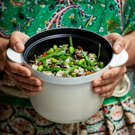 Our rice pot features an inner stoneware lid with steam vents that prevent boil-overs, making it ideal for cooking rice and other grains. The curved walls and tight-fitting lid promote even heat and moisture circulation, ensuring perfectly cooked grains. Thanks to its ergonomic flat handles, the rice pot moves easily from stovetop to table.