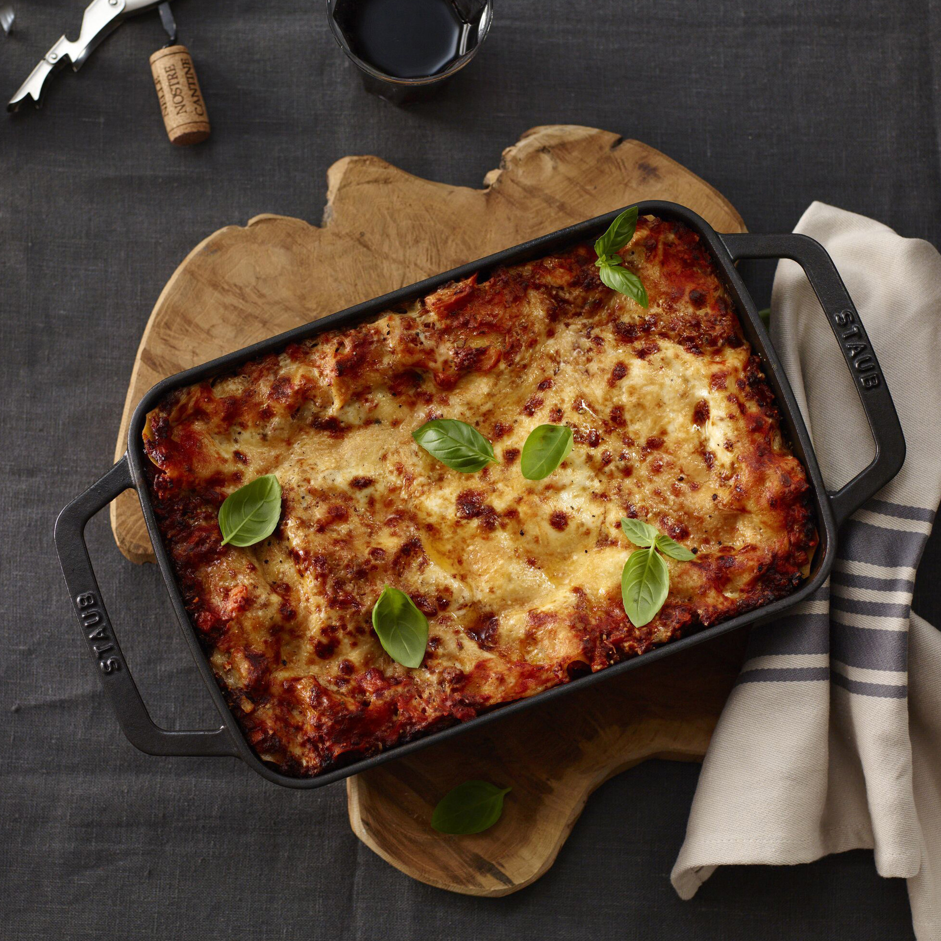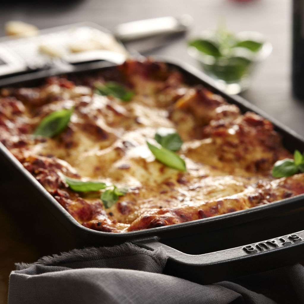 The Staub rectangular roasting dish lets you prepare flavorful meals both on the stovetop and in the oven. It’s ideal for classics like lasagna, moussaka, and scalloped dishes.