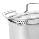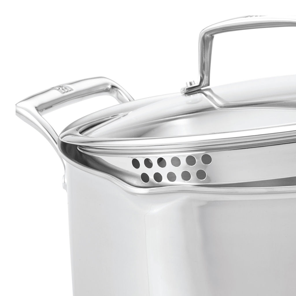 This stock pot comes with a tempered glass lid that helps retain moisture, along with two built-in strainer hole sizes on the sides so you can align them with the pour spouts to easily drain liquid from your food.