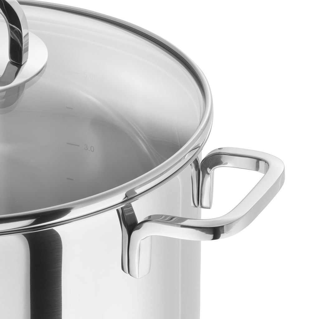 The saucepans range in capacity from 1.5 to 6 liters and, with the exception of the saucepan, all feature a tight-fitting glass lid. So you always have an eye on what's simmering and boiling.