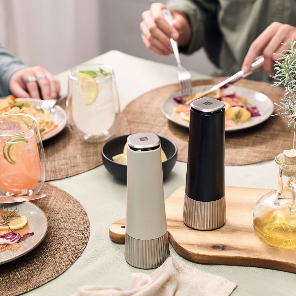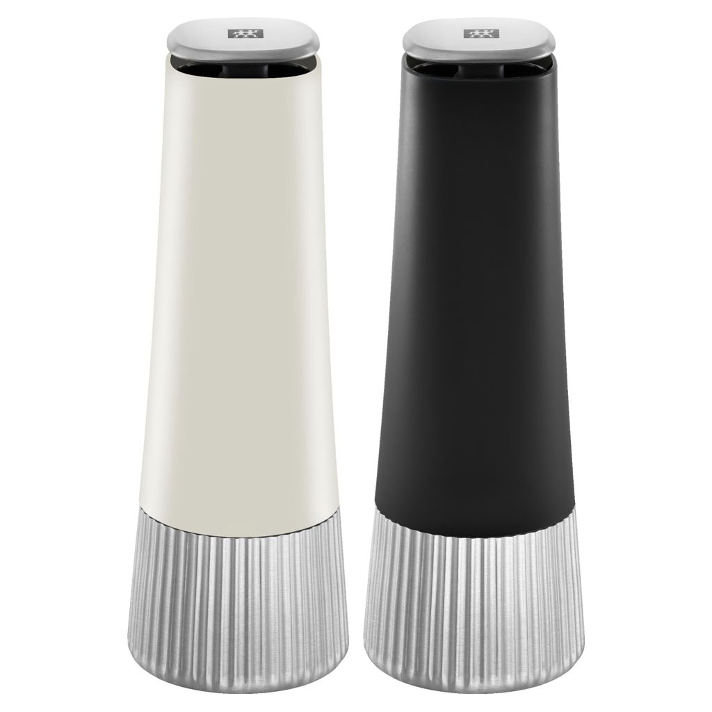 Two mills. One innovation. A twist for more explosive flavors in your kitchen. ZWILLING Spices mills. Inverted design in black and ivory. The special feature: the grinder is located at the top end of the mills. This prevents spices from dripping and keeps the table and worktop clean.