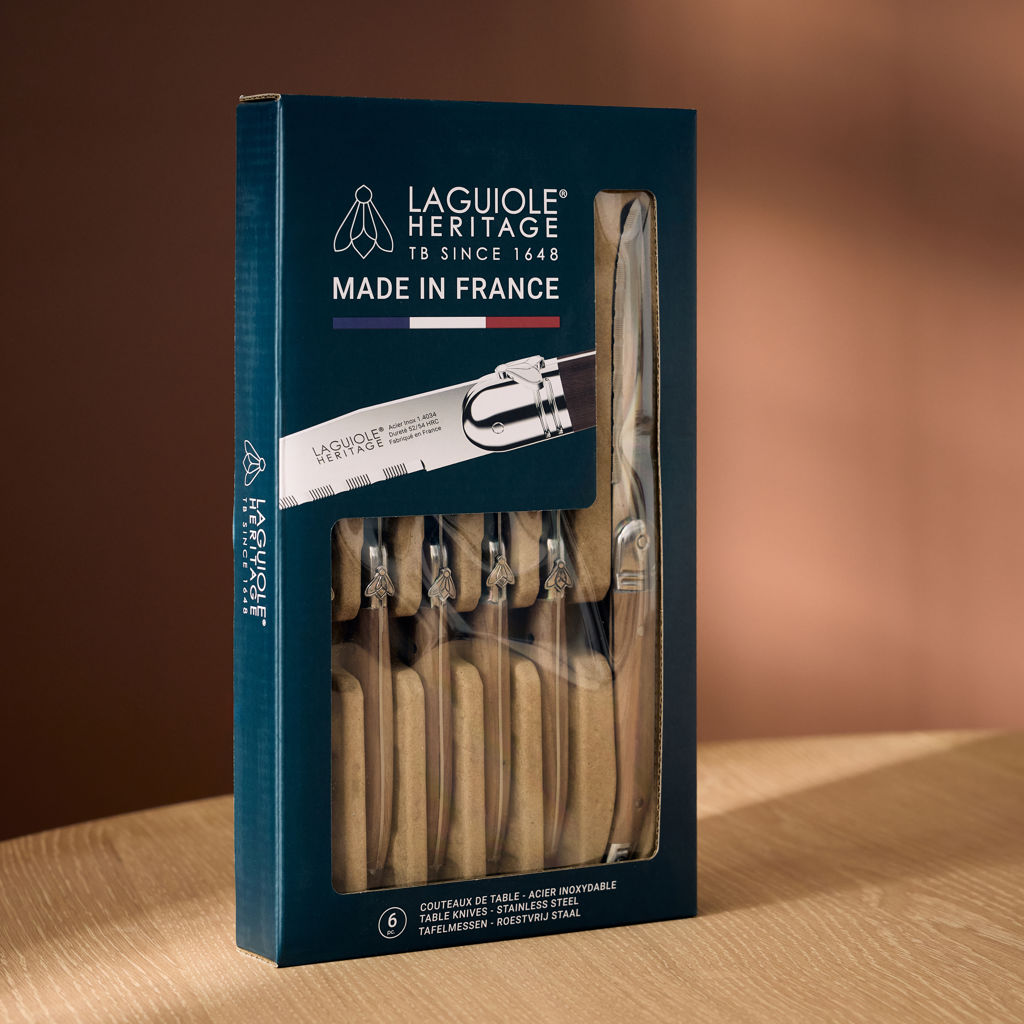 The Laguiole Heritage set of 6 steak knives, presented in an elegant wooden case, is designed for precise meat cutting.