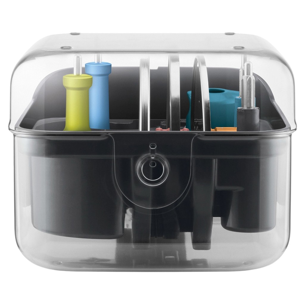 Houses all attachments and cleaning utensils conveniently when not in use.