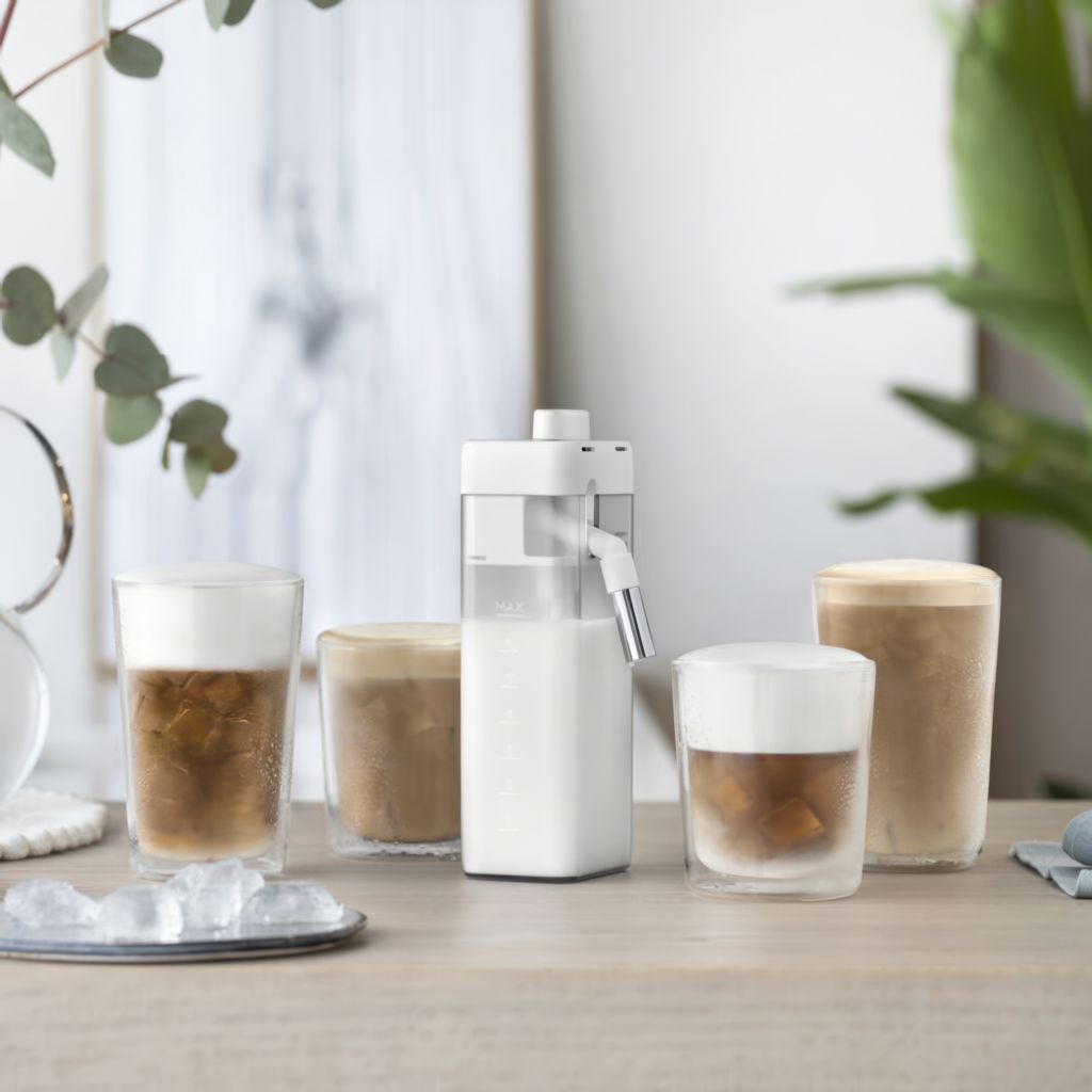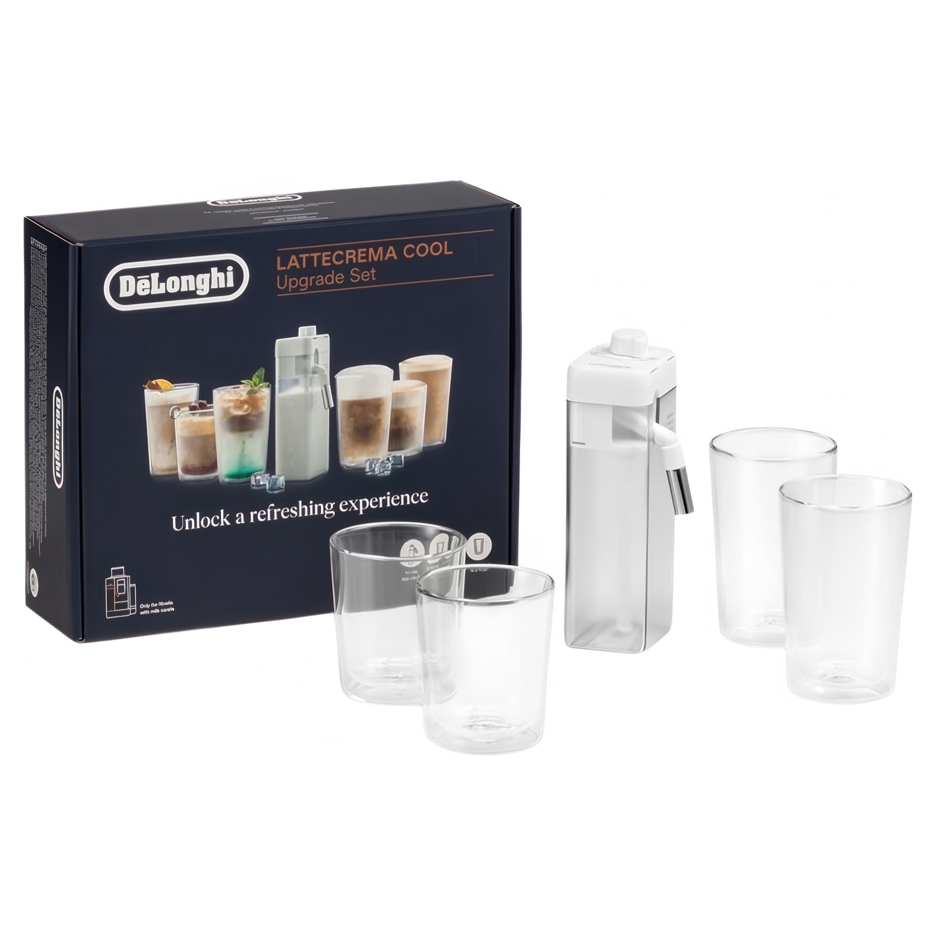 Enhance your coffee experience with the LatteCrema Cool kit, which unlocks 6 exclusive recipes with cold milk and includes a LatteCrema Cool carafe and 4 double-walled glasses.