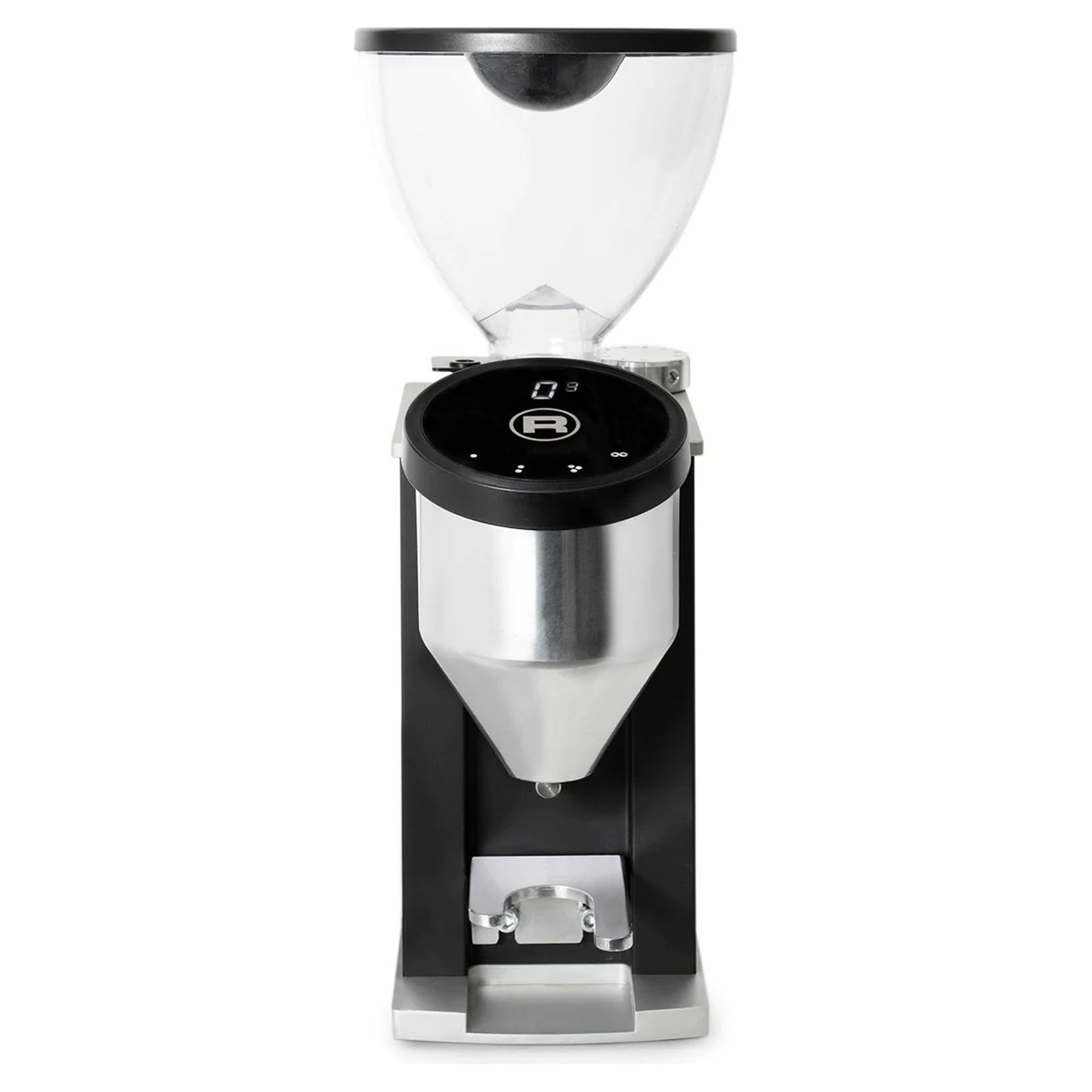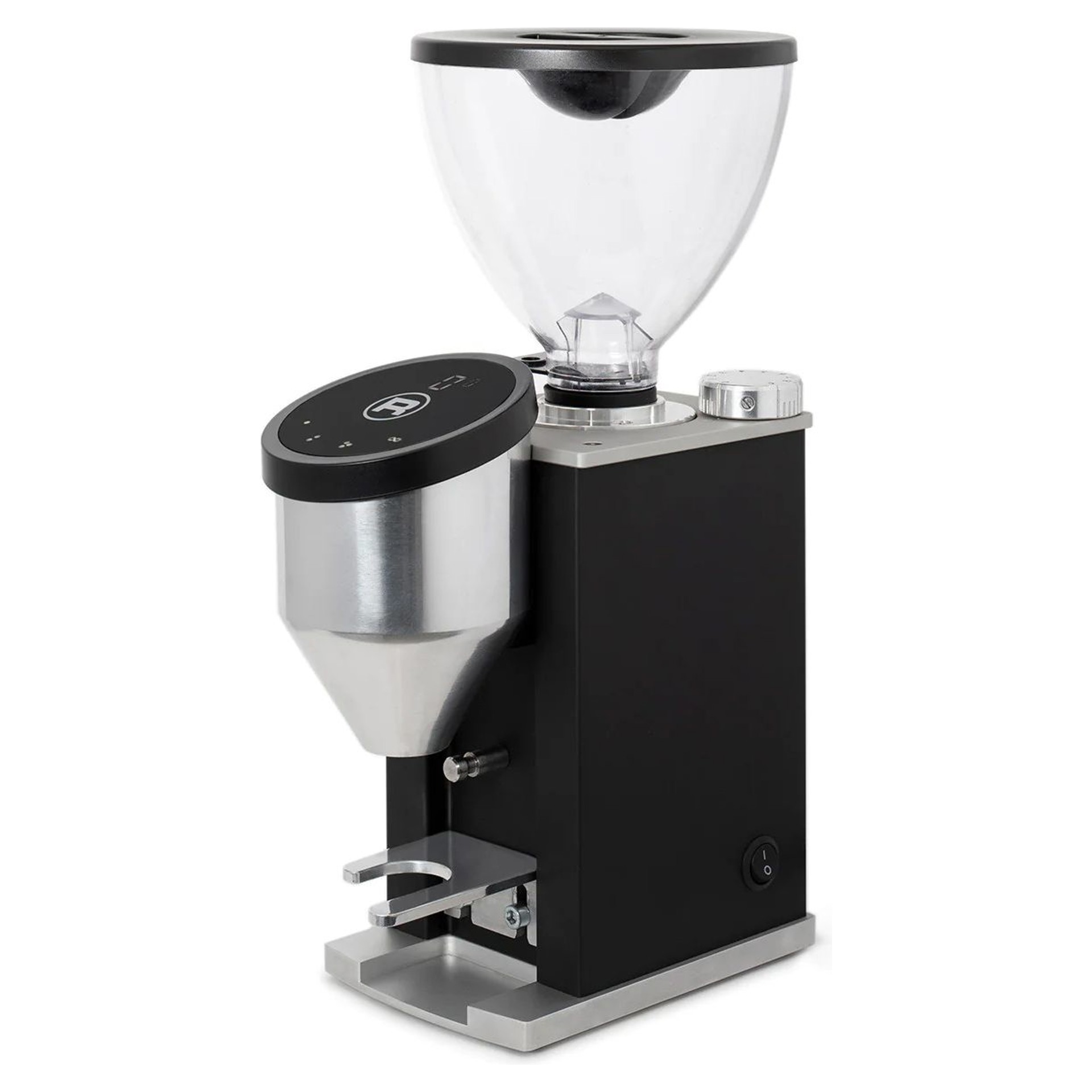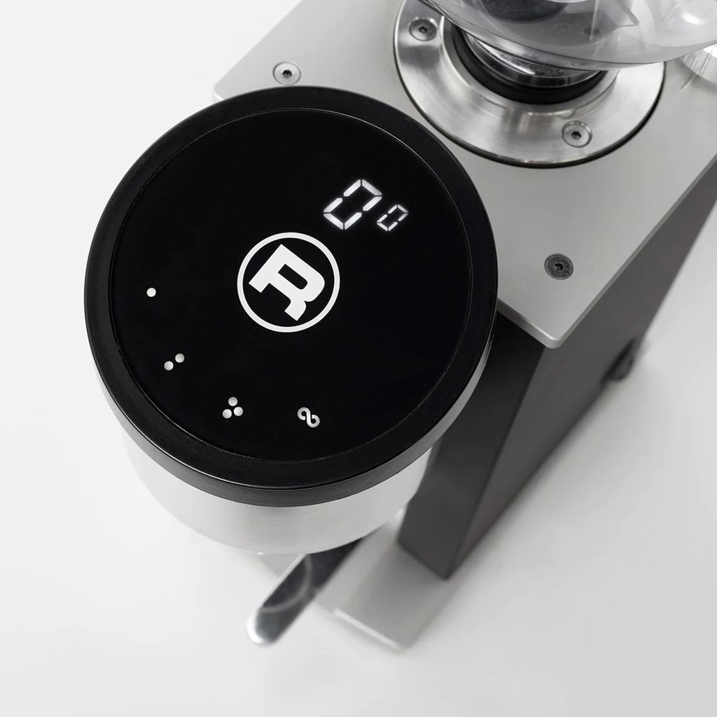 Inside, a soundproof housing, 50mm continuous flat cutter, anti-static grounding chute, and contoured dosing cone ensure clean and consistent filling of the filter holder. The controls are mounted at a slight angle with a high-contrast touchscreen that allows for dosing options or continuous grinding modes.